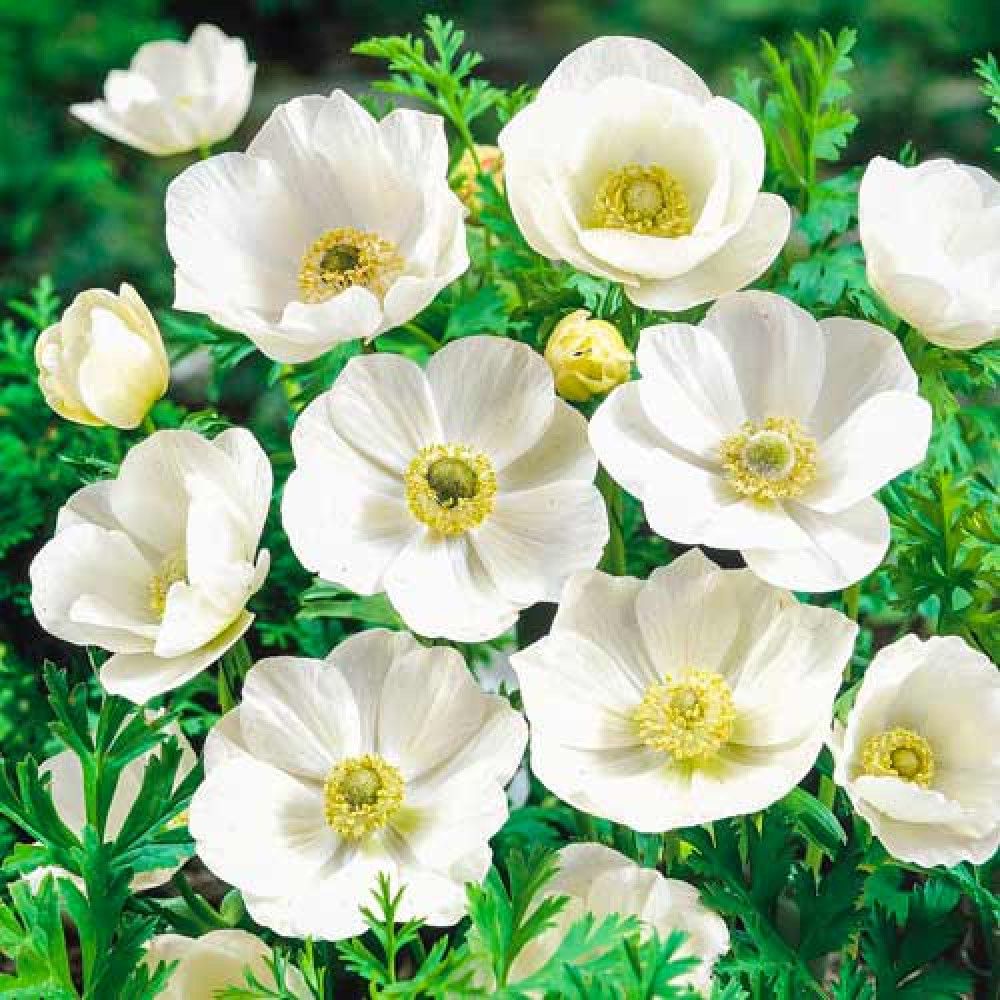 Анемона Невеста – неприхотливый многолетник с обильным белоснежным цветением. Растения невысокие – около 30 см, но могут быть и ниже. Цветки крупные, круглые, с широкими лепестками молочного цвета и лимонно-желтыми тычинками. Резные листья красивые, темно-зеленые. Цветет нежная красавица в августе-сентябре. Сорт подходит как для создания садовых композиций, так и для оформления балконов, веранд. Сорт любит рыхлые плодородные почвы. Анемона плохо переносит переувлажнение, поэтому стоит позаботиться об организации дренажа.