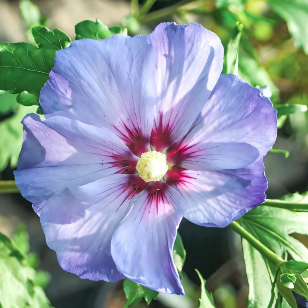 Гибискус Азурри — красиво цветущий сирийский сорт. Пика декоративности достигает на 3−4 сезон после посадки. В первый год жизни растет очень медленно, затем ускоряется и набирает высоту до 1.5 метров. Круглое лето формирует сиренево-голубые цветы диаметром до 15 см. Это один из самых крупноцветковых сортов. Лепестки как бы подсвечены изнутри жемчужными переливами. Желтая сердцевина акцентирована веерно расходящимися пурпурными лучами.