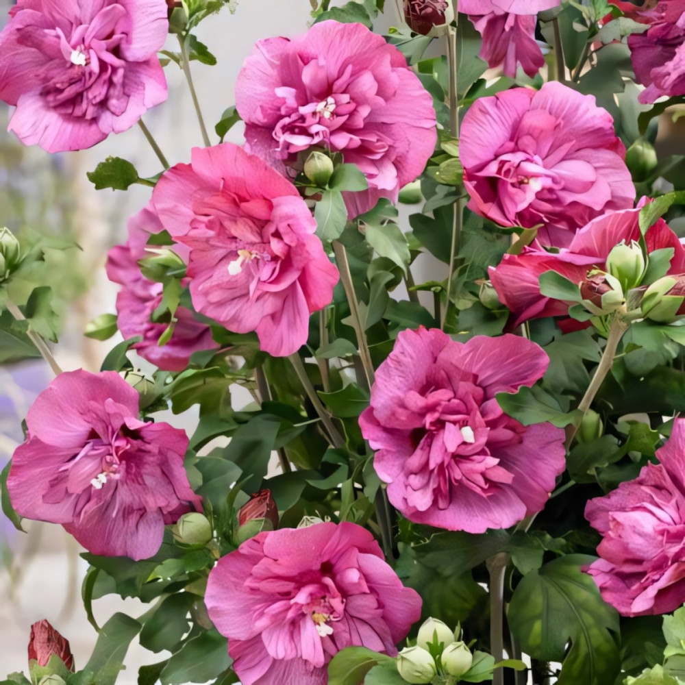 Гибискус Маджента Шифон формирует чудесные махровые цветы диаметром 10−12 см. Лепестки окрашены в пурпурно-красный цвет с оттенком фуксии.