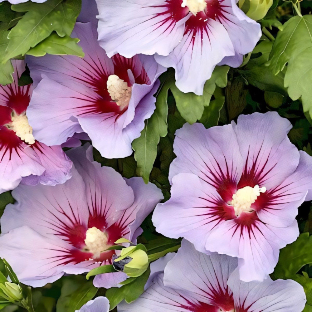 Гибискус сирийский Марина – это декоративный кустарник листопадного типа. Средняя высота взрослого растения составляет 1,5-2 метра. Трехлопастные листья темно-зеленого цвета смотрятся очень эффектно. Цветение растения приходится на период с июня по сентябрь. Цветы голубовато-лиловые с пурпурной сердцевиной и такого же цвета штрихами, исходящими из центра. Диаметр цветка – 9 см.