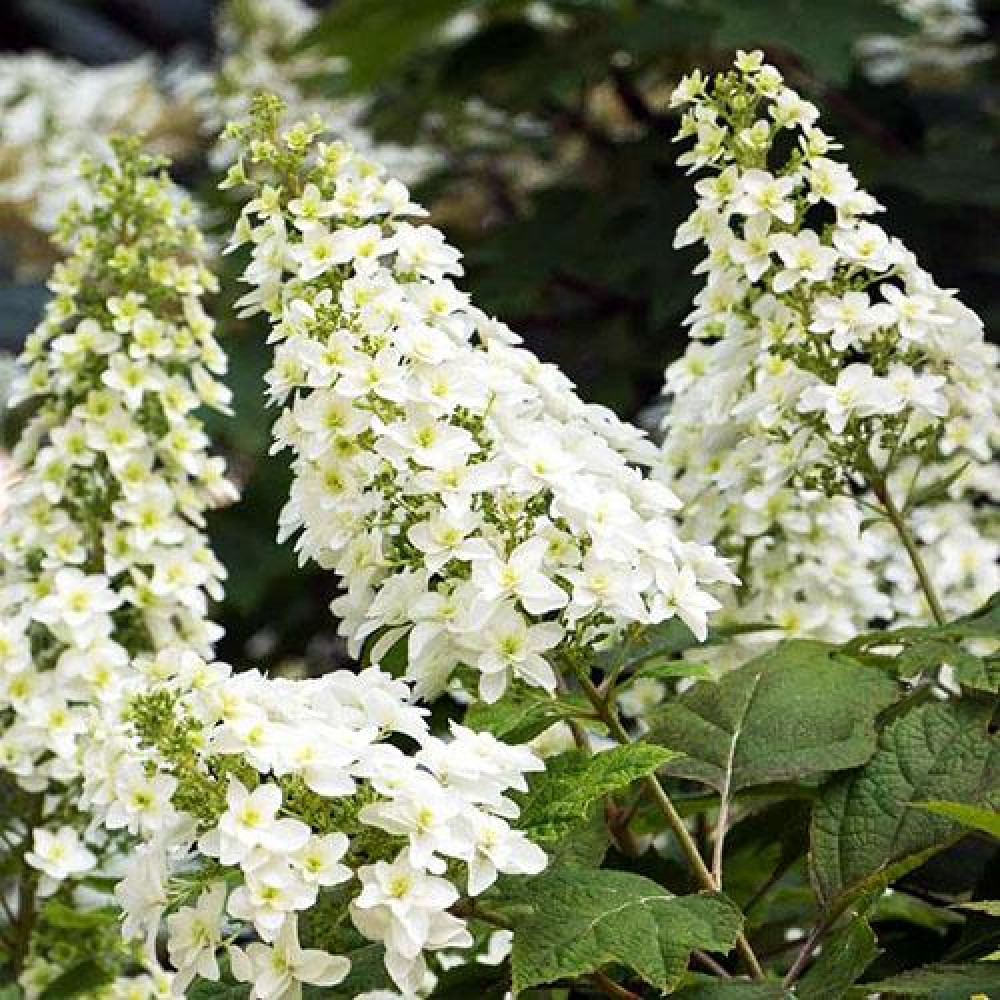 Ценится за форму листьев и за крупные метельчатые соцветия. Листья, в отличие от всех остальных гортензий, не цельные, а 3—7-лопастные, похожие на листья дуба, откуда и произошло видовое название. Листья сверху серебристо-зеленые и голые, снизу опушенные, до 20 см длиной. К осени листва-малиновая. Соцветия метельчатые, до 30см длиной, с крупными белыми стерильными цветками величиной 3-4 см. Цветет в июне-августе. Растет быстро, сохраняет длительное время цветоносы.