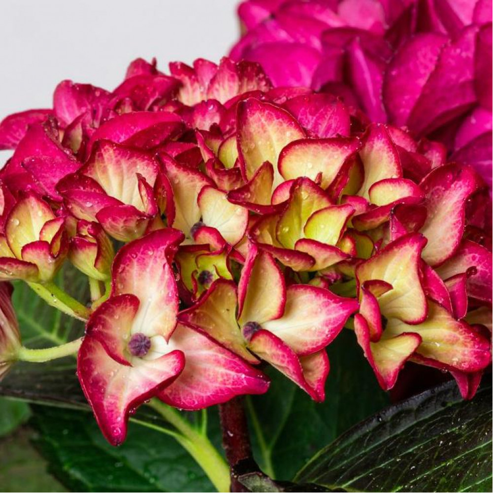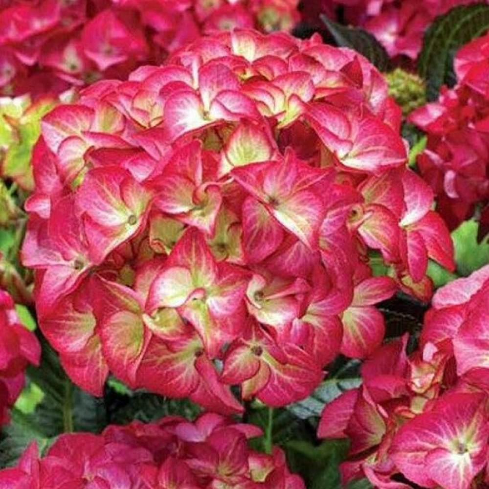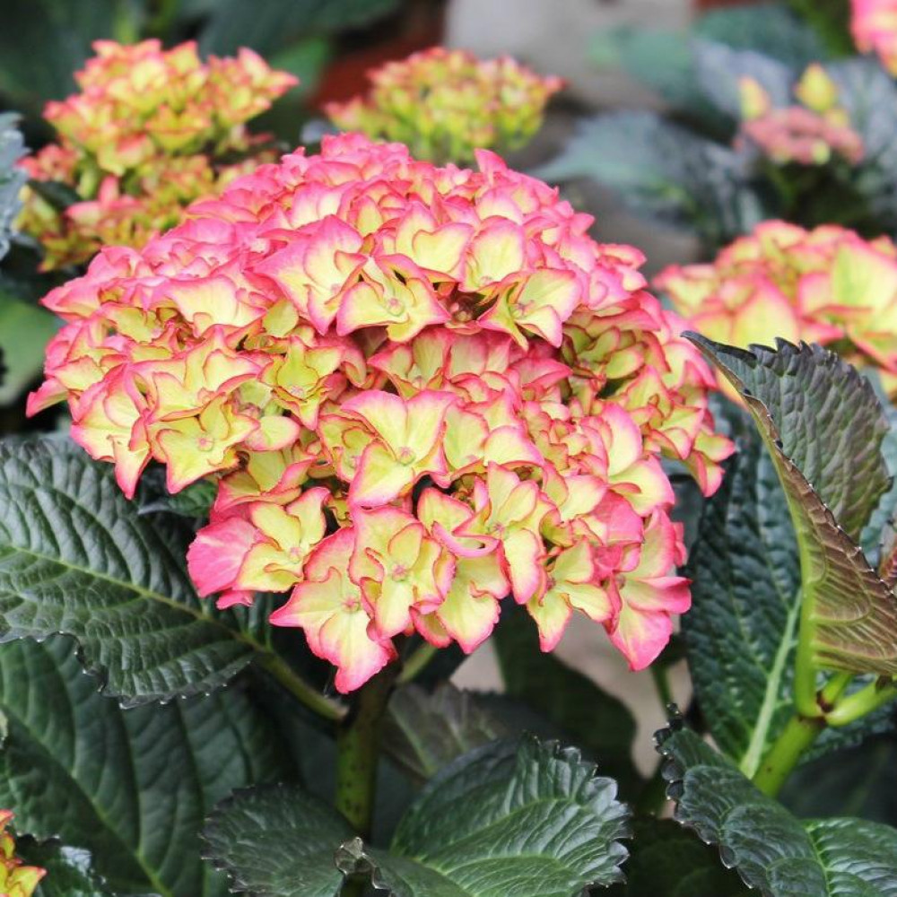 Компактный куст с прямостоячими побегами высотой до 1,5 м при выращивании в открытом грунте и не более 0,6 м - в горшках. Цветы ярких оттенков: у основания преобладает зелёный цвет, ближе к середине он плавно переходит в жёлтый, затем в розовый. Концы лепестков окрашены в красный оттенок. Их окрас меняется от розового до насыщенного красного оттенка, в зависимости от стадии цветения и кислотности почвы. Цветы собраны в шаровидные соцветия диаметром 20 см. Листья крупные овальной формы заостренные вверху и с зазубринами по бокам имеют темно-зеленый оттенок с коричневым отливом по краю. Молодые листья пурпурного оттенка с четко выраженными зелеными прожилками.