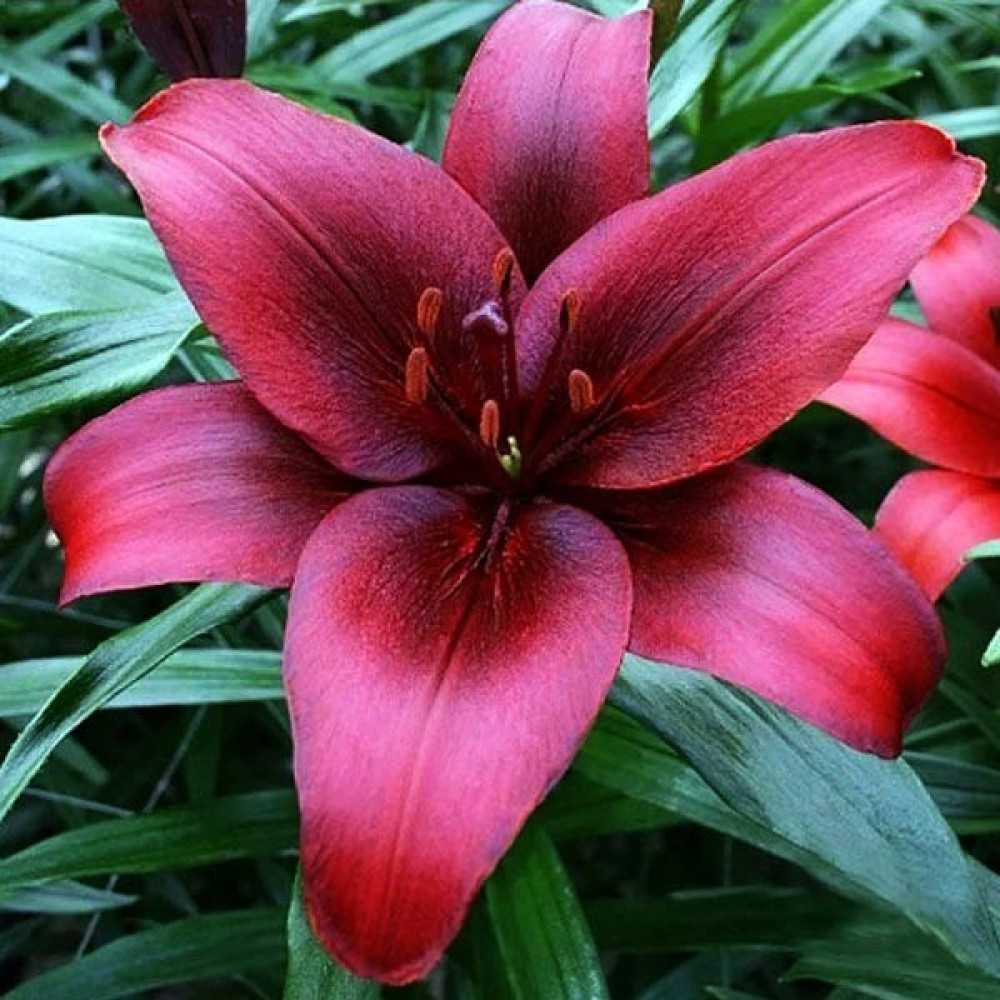 Азиатский гибрид с очень редким окрасом. Высота растения до 50 см. Цветки крупные, с глянцевыми лепестками тёмно-красного цвета, кончики лепестков имеют более светлый оттенок. Цветение очень обильное. В группах производит великолепное впечатление.