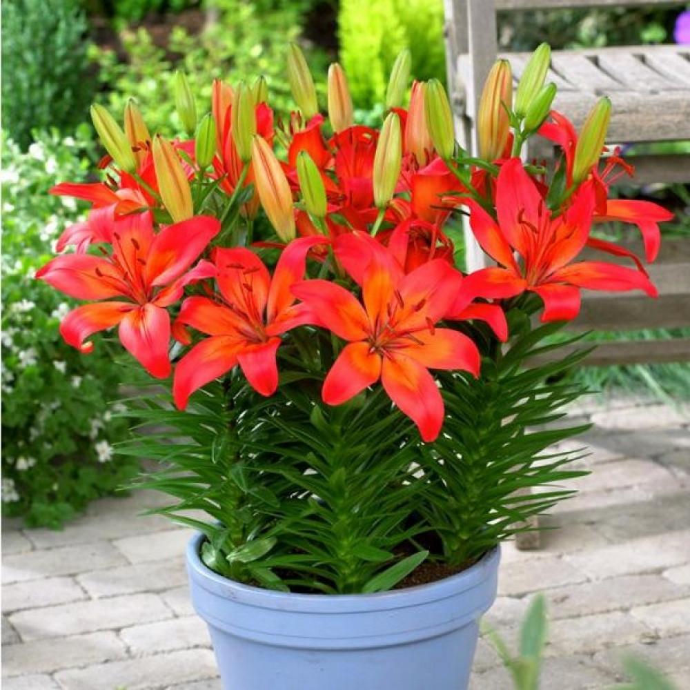 Луковицы азиатской горшечной лилии Matrix привлекают внимание двухцветной окраской. Формируют прочные, утолщенные, густооблиственные стебли высотой до 45 см. Цветки крупные, диаметром около 16 см. Лепестки красные, с оранжевым центром. Тычинки терракотовые. Зацветают в июне и июле. Лилии выращивают в открытом грунте и в кашпо. Цветут обильно при условии размещения на освещенных участках и при умеренном поливе. Растения не любят влажного воздуха и сильных ветров. Подходят на срез, долго сохраняют свежесть в букетах. Зимостойкие, не боятся вредителей.