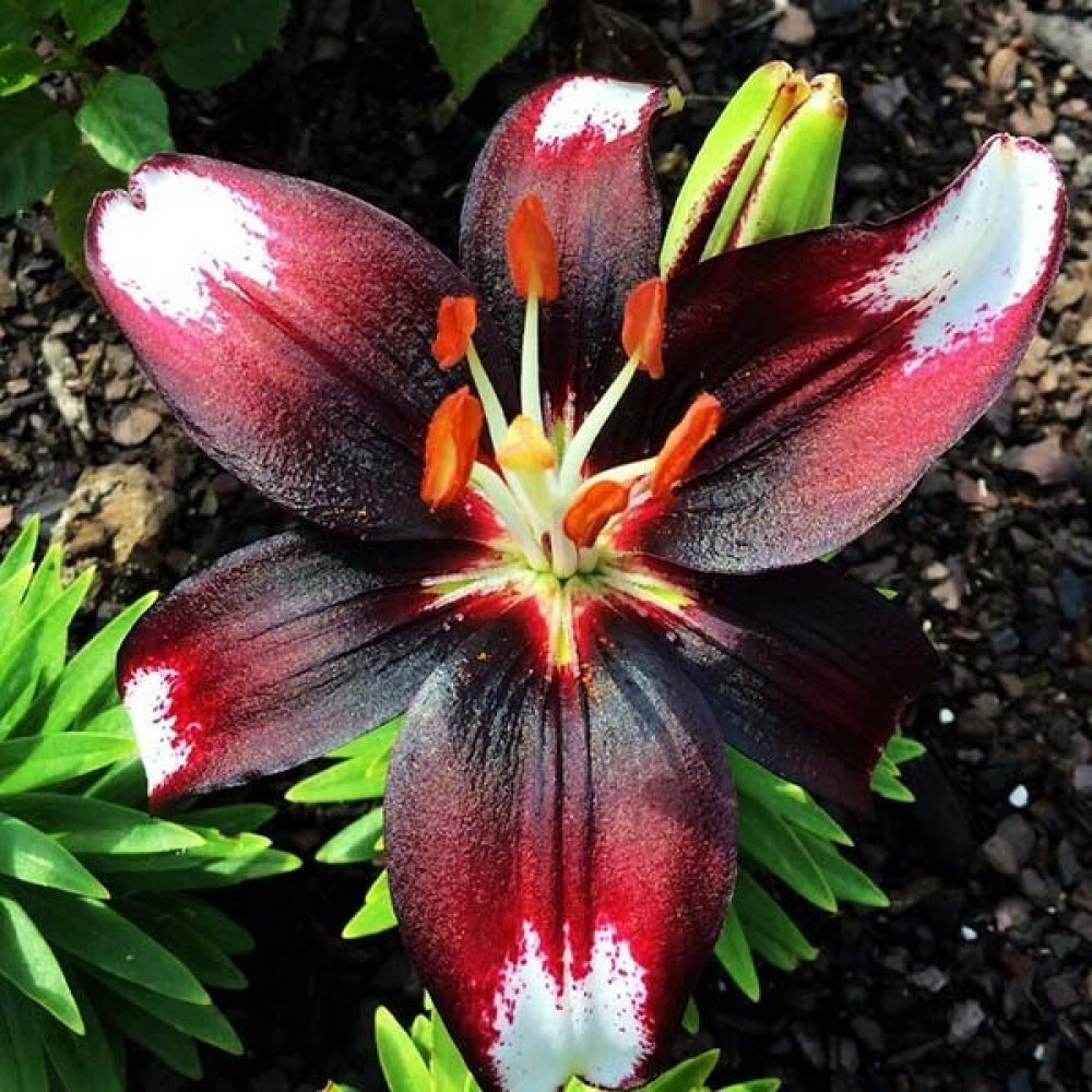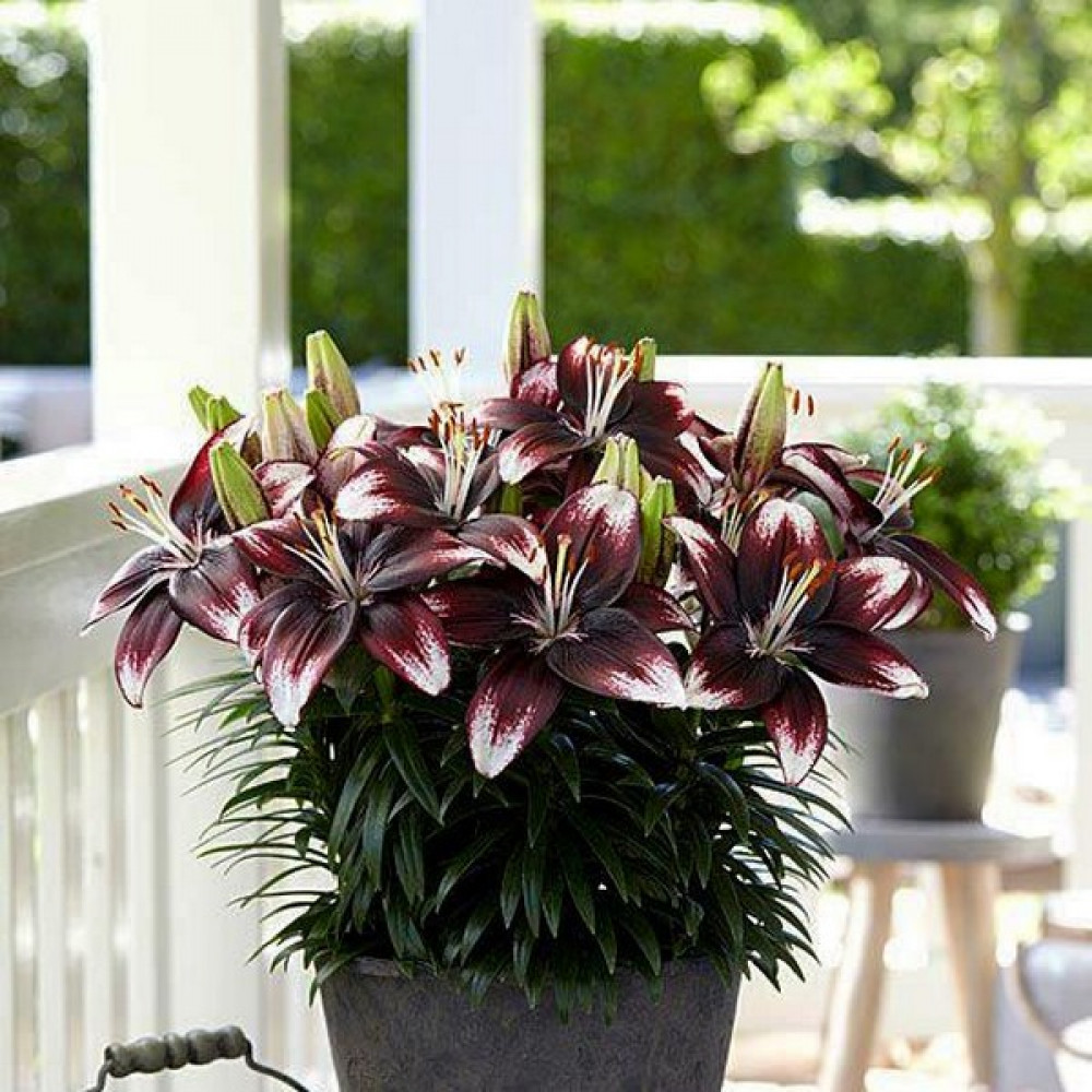 Очень эффектный сорт, несмотря на свои скромные габариты. Низкая лилия удивляет размерами бутонов. Цветок имеет необычный окрас, он бордовый, но ближе к сердцевине становится практически черным, кончики белые. Сорт выведен специально для контейнерного выращивания. Можно вырастить у себя на балконе, веранде, террасе.