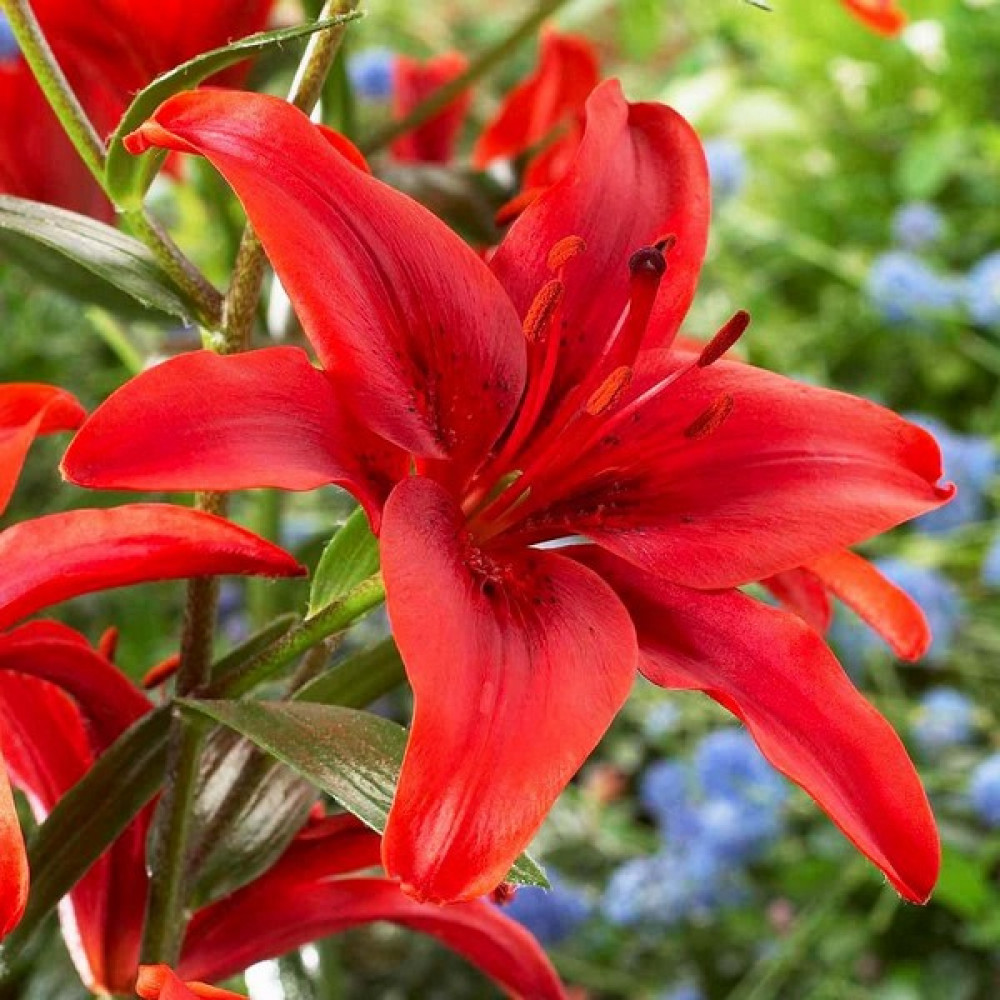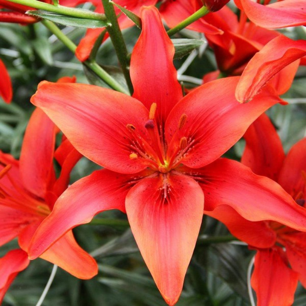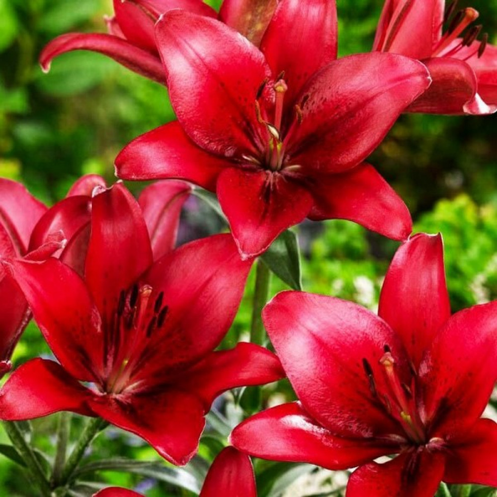 Лилия Red County (Рэд Каунти)-этот азиатский гибрид наделен потрясающими глянцевыми соцветиями броской красной расцветки. Их глубокий и равномерный цвет подкрепляют рыжие тычинки и бордовые крапинки. Каждое соцветие смотрит или строго вверх, или же в бок. Но в любом случае оно состоит из трех чашелистников и стольких же основных лепестков. При этом размеры раскрывшегося бутона поражают! А теперь представьте, что эти гиганты еще и пахнут! Получается, что не купить лилию Red County (Рэд Каунти) значит совершить преступление против собственного сада.