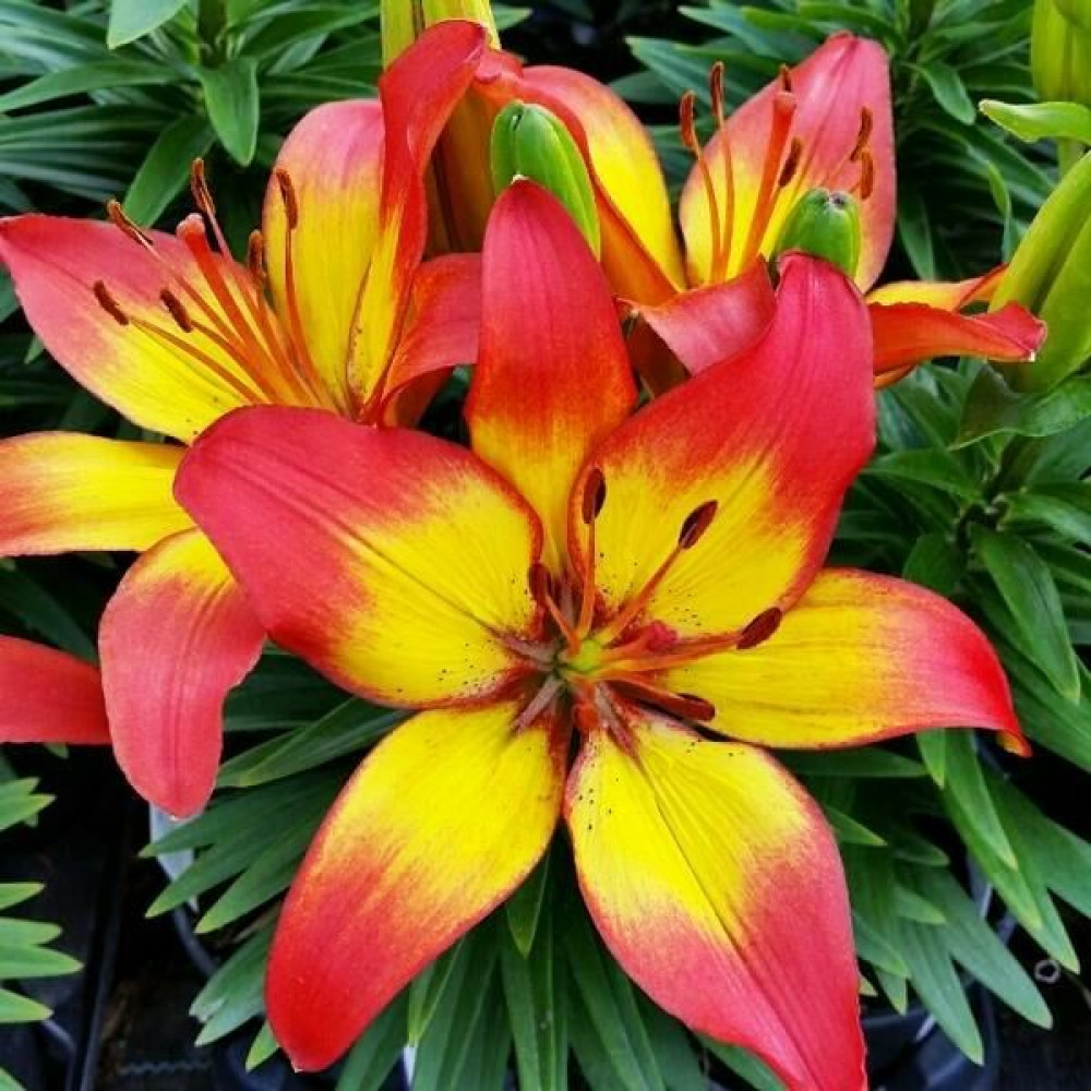 Эта лилия заслуживает вашего внимания. Он напоминает другой сорт лилии Orange Pixie. Цветки зацветают через 60-65 дней после посадки. Они просто заряжают своей солнечной энергией всех вокруг! Цветки простые, шестилепестковые, достигают до 16 см в диаметре. Бутоны направлены вверх и похожи на свечи. Длина бутона составляет 9 см. Цветоносы невысокого роста, прочные. Они вырастают в высоту до 40-50 см. Они вертикальные, выровнены, с глянцевыми узкими листьями. Их окрас темно-зеленый. Листья эффектно контрастируют с солнечными цветками.