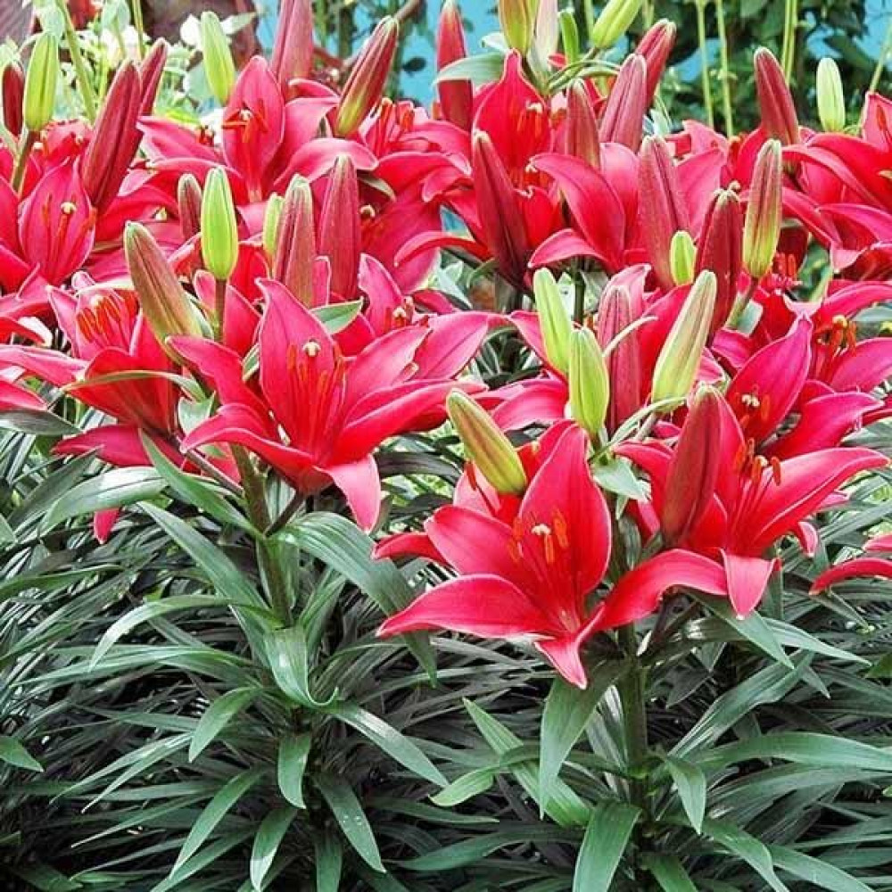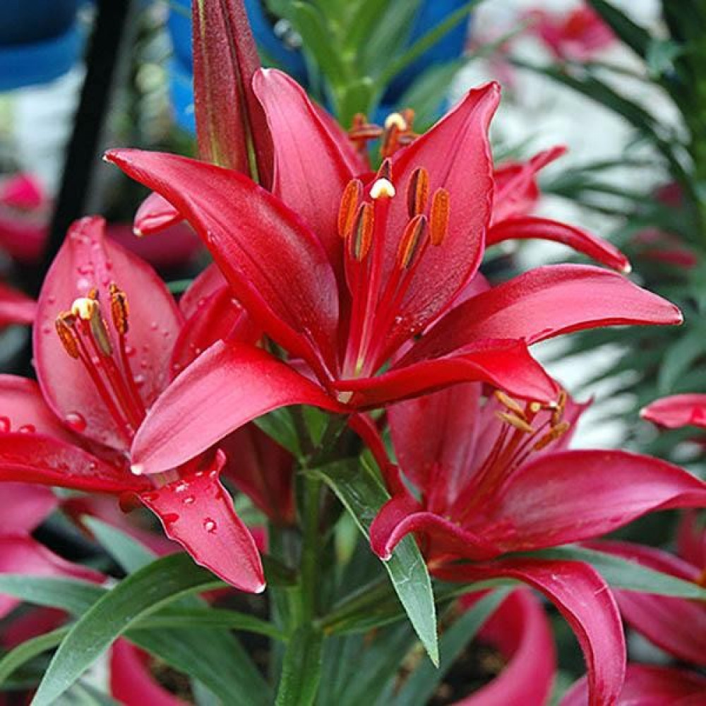 Изящная лилия с крупными цветками. Цветки карминно-красные, лепестки заостренные. Подходит для горшечного выращивания на балконе и в комнате, или для украшения бордюров.
