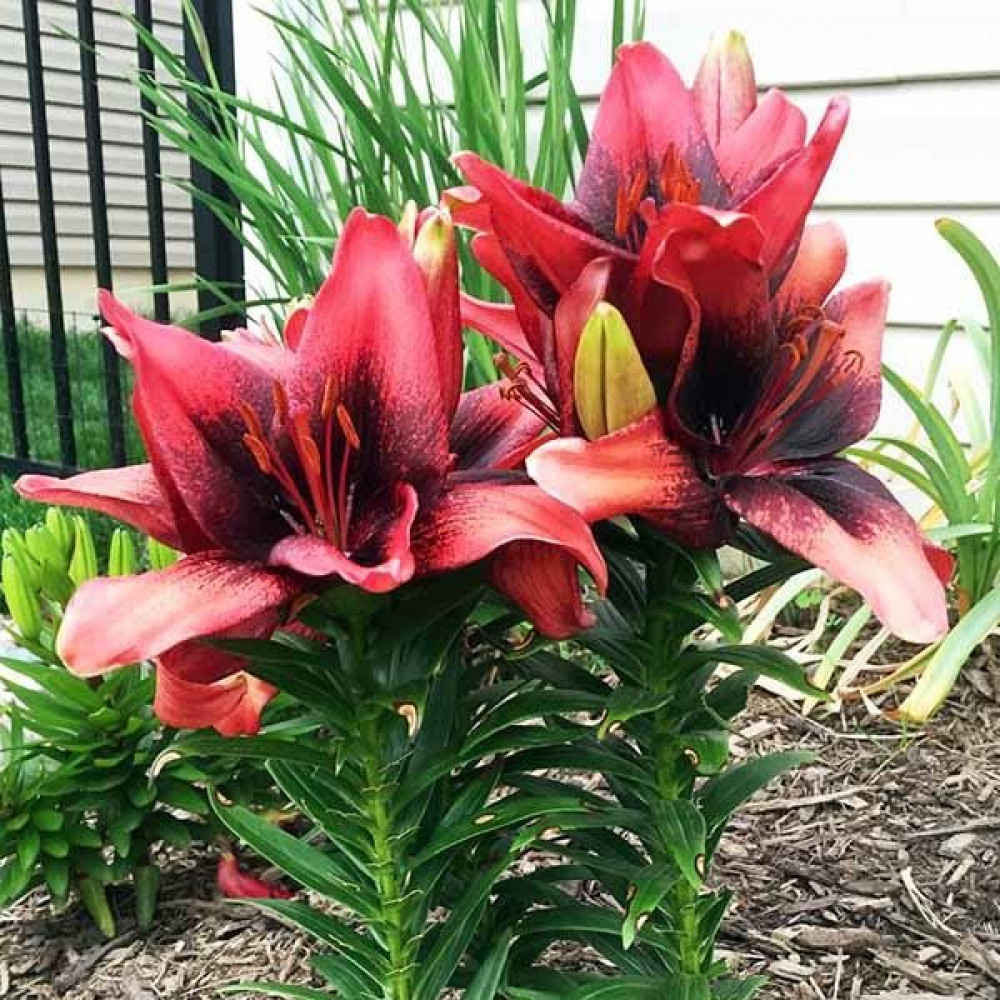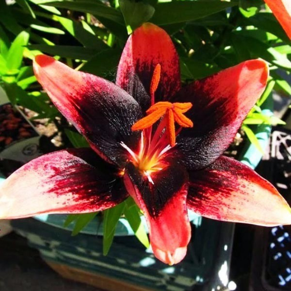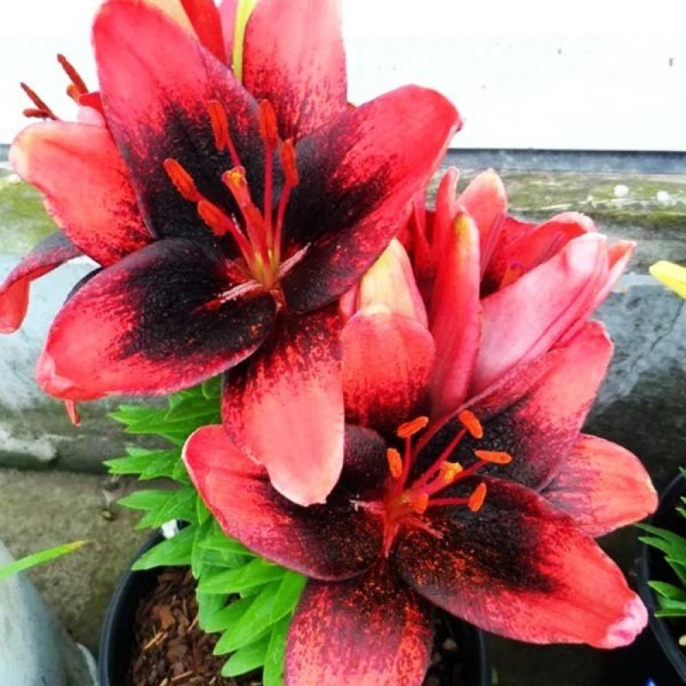 Низкорослый азиатский гибрид лилии. Лепестки светящиеся кораллово-красные с темным, почти черным танго пятном. Сорт идеально подходит для выращивания в горшках и вазонах, а также в низких цветущих бордюрах.