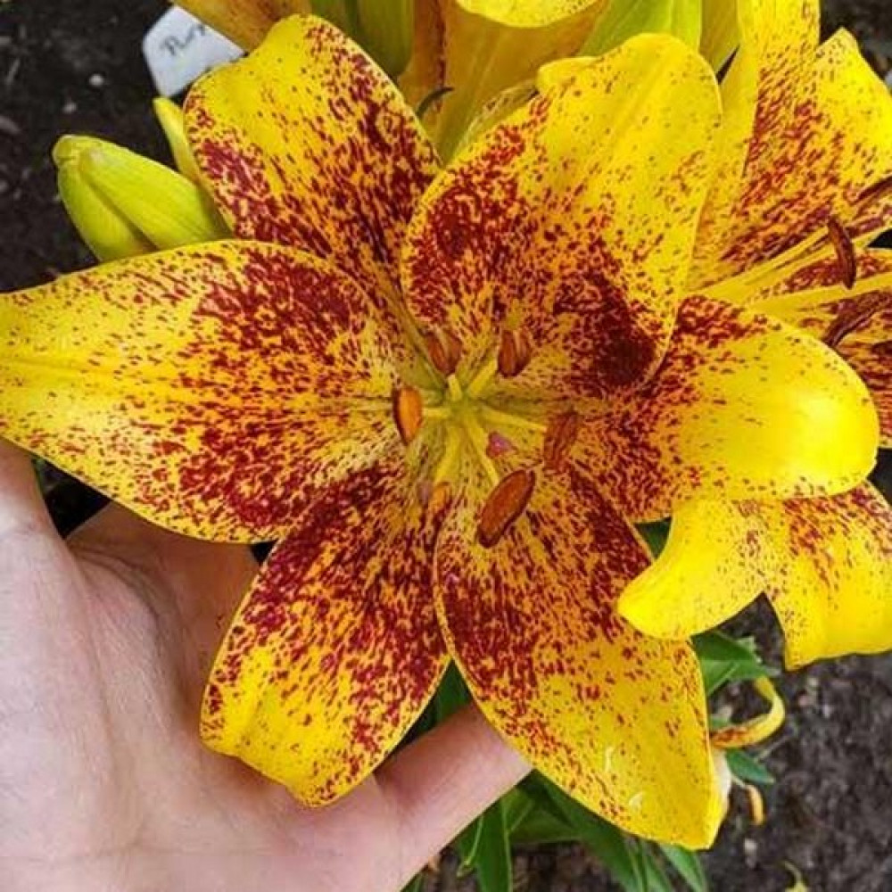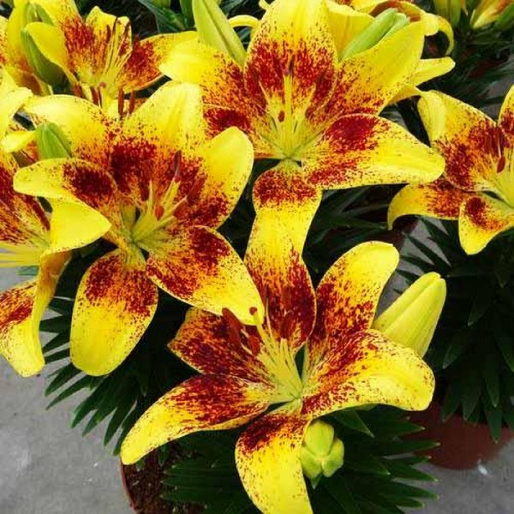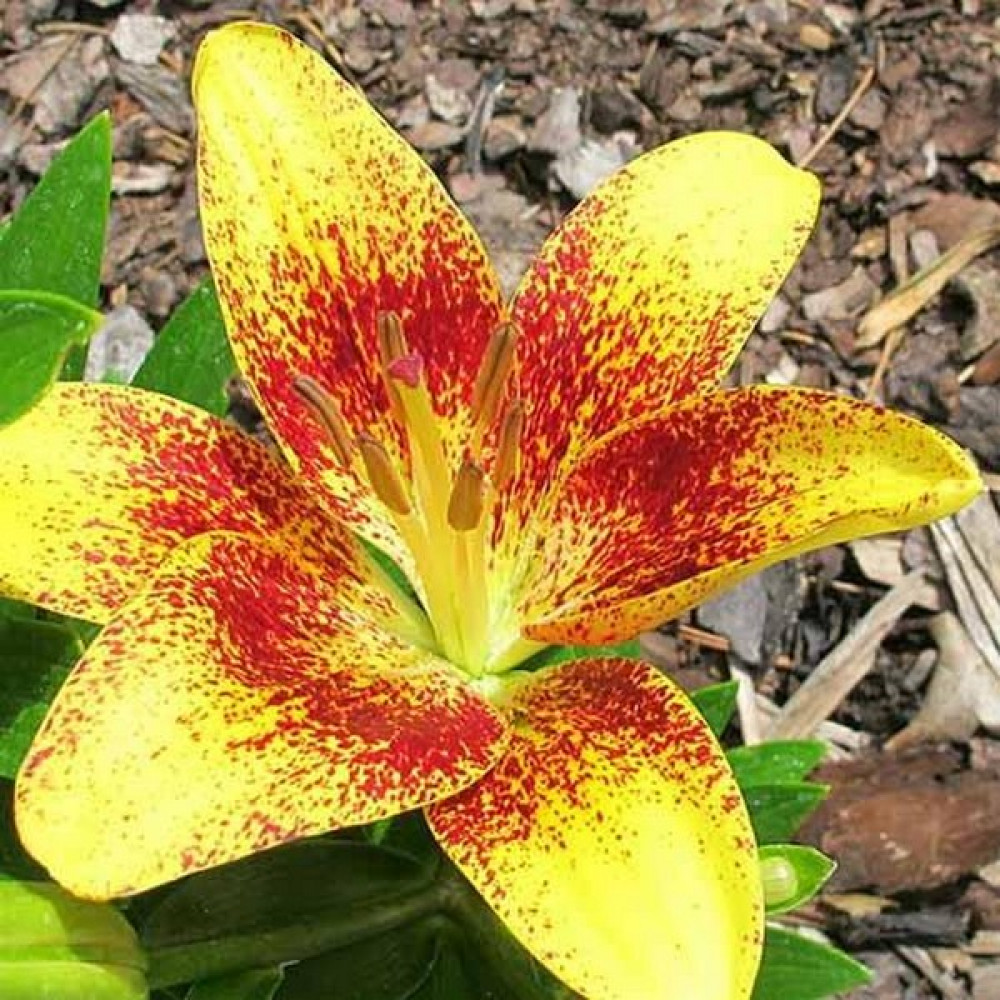 Одна из самых ярких лилий, ведь ее окрас необыкновенен: на золотисто-желтом фоне разбросаны багровые крапинки, образующие почти сплошной окрас ближе к центру.