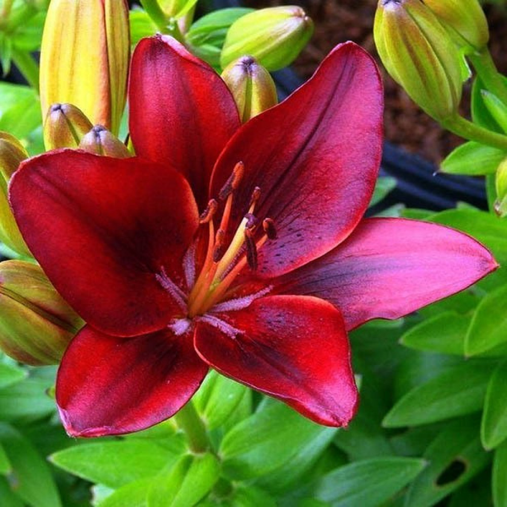 Карликовая лилия имеет высоту не более 45 см. При этом ее цветки можно назвать просто огромными для такого миниатюрного растения, их диаметр составляет около 20 см. Лепестки имеют насыщенно красный оттенок, ближе к центру они затемнены крапом винного оттенка. Небольшие тычинки имеют контрастный кирпичный оттенок. Листва густая, темно-зеленая, густо покрывает побеги. Аромат очень деликатный, изысканный.