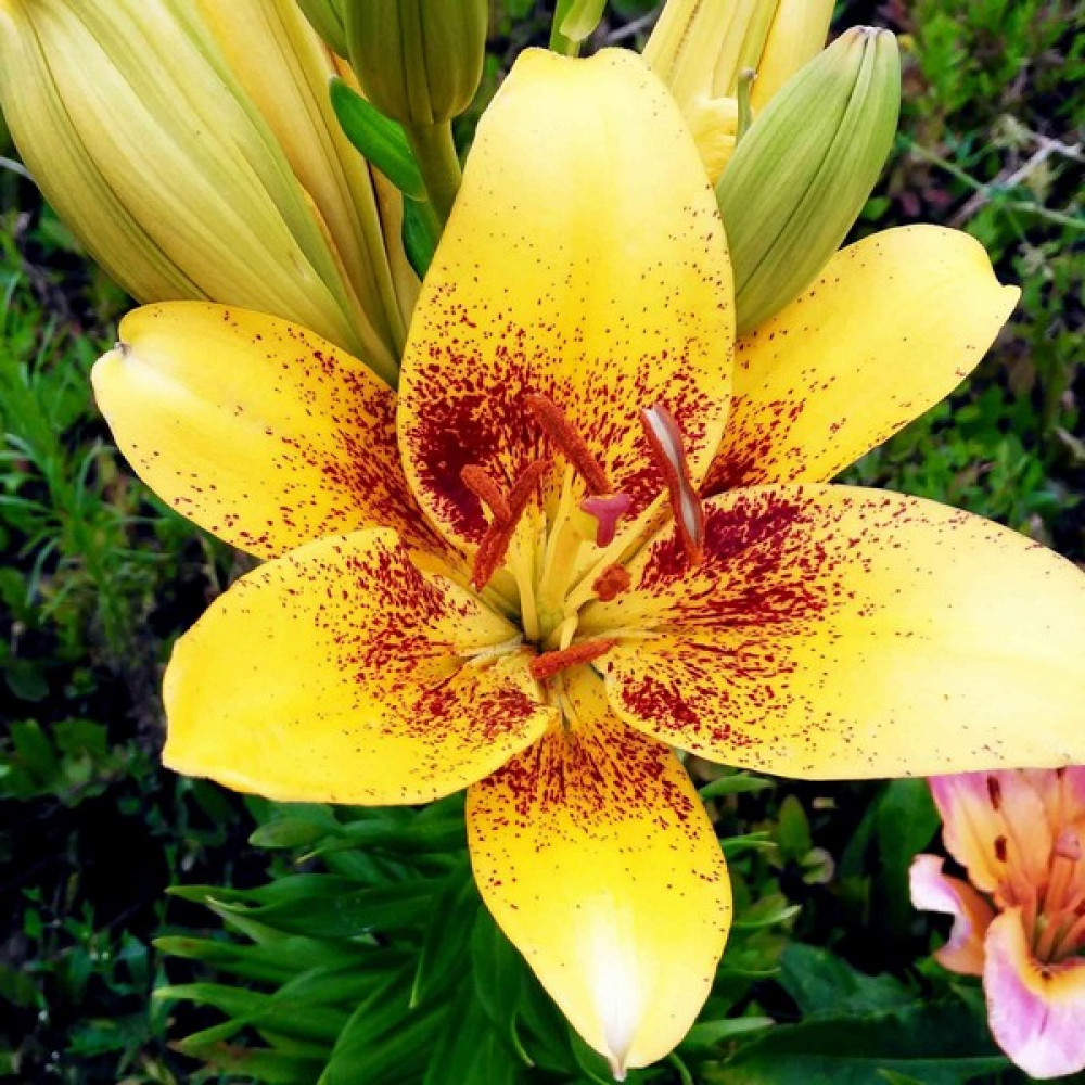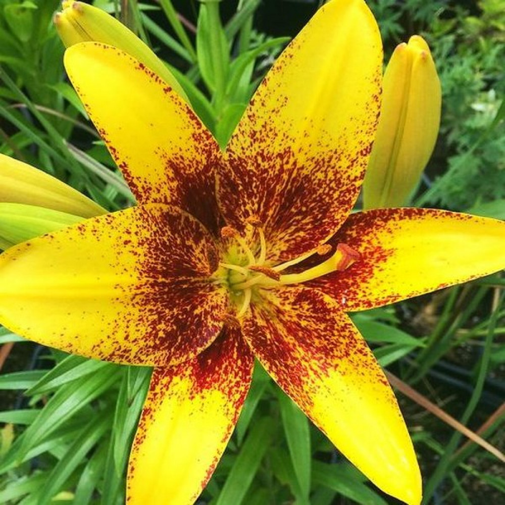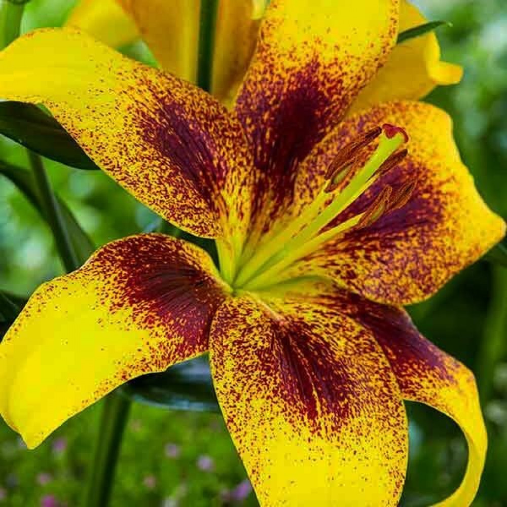 Лилия танго азиатская Yellow Brush (Йеллоу Браш) - замечательный азиатский сорт с классическими по форме соцветиями и высокой зимостойкостью. Звездчатые цветки способны достигать 17-ти см в окружности и иметь вполне солидный вес из-за плотности, жесткости и внушительных размеров лепестков. Несмотря на это, широко раскрытые бутоны не поникают, а старательно вглядываются в июльское небо, лишь изредка поворачиваясь по сторонам. Крепкие метровые цветоносы долго остаются ровными и упругими, а цветки дольше недели остаются свежими и ароматными. Их сочная ярко-желтая окраска не тускнеет и не становится коричневой даже перед самым моментом опадания лепестков.