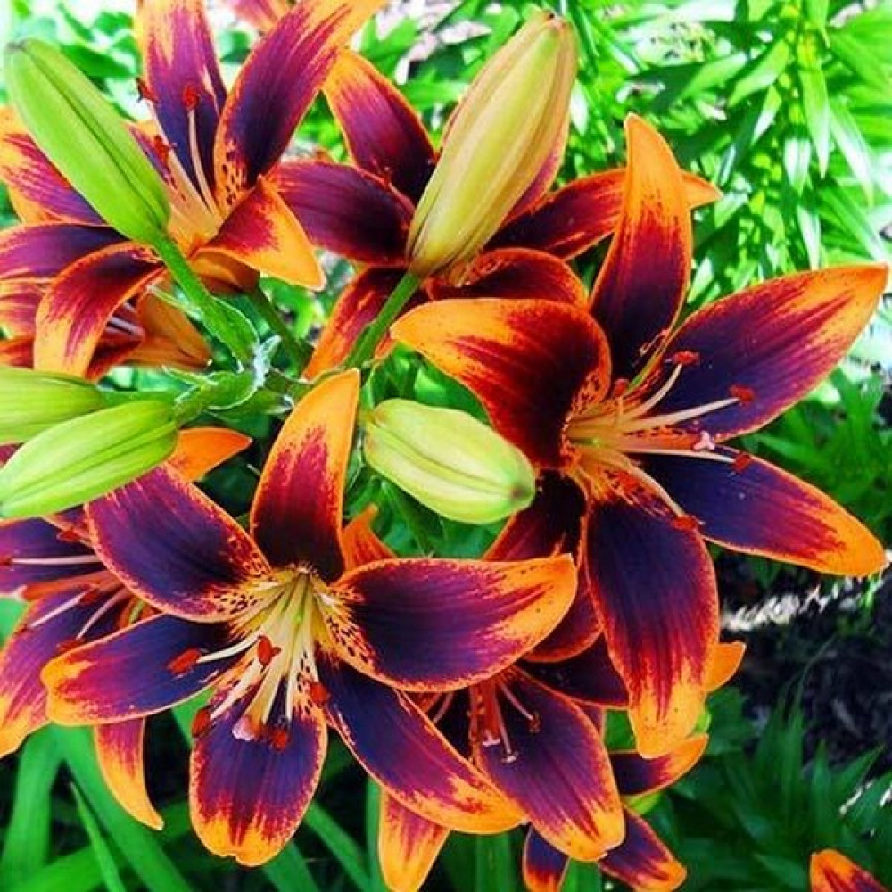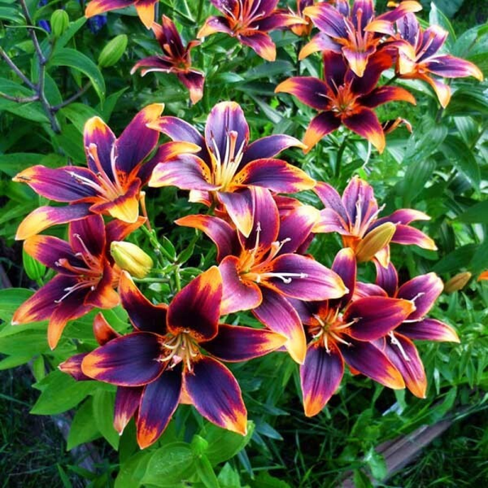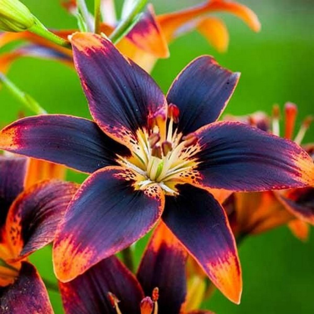 Беспорный лидер среди азиатских гибридов. Двухцветный. В летнее солнце обращенные вверх цветки теплых тонов просто светятся! Они поразительной расцветки: блестящий, сливово-черный окрас лепестков эффектно контрастирует с яркими оранжевыми кончиками и оранжевой серединкой. Кажется, что цветок загорел на солнышке. Цветки достаточно крупные в диаметре. Каждый из них имеет три лепестка и три чашелистика, которые между собой очень похожи. Лепестки и чашелистики плотные, остроконечные. Цветки появляются на вершине высокого стебля. Они собраны в соцветия по несколько штук. Нектарники белые, опушенные.