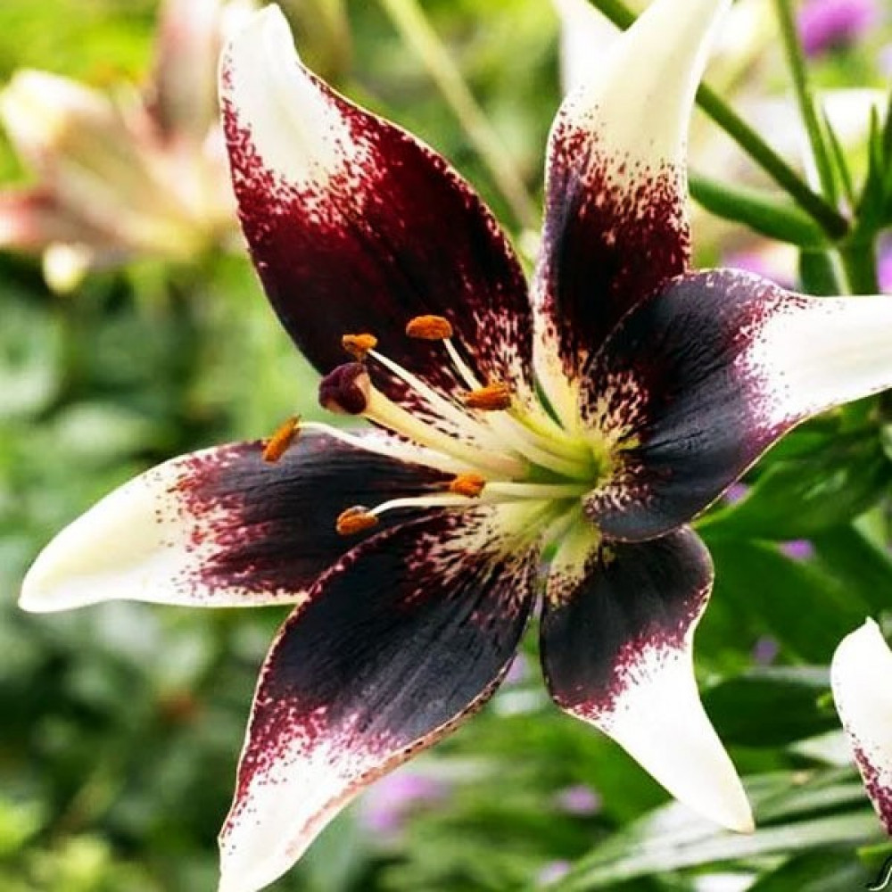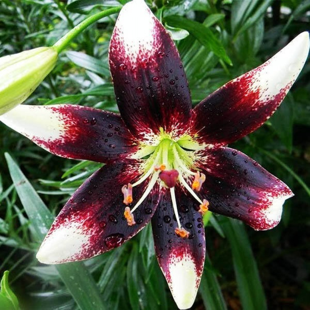 Яркая и изящная лилия! Уникальная окраска делает её поистине шедевром. Цветы этой азиатской красавицы внесут задорный колорит в любую клумбу и букет. Довольно крупные цветы для этого типа лилии представляют собой контрастное сочетание белоснежного и темно-красного цвета. Белоснежный кончик лепестка переходит к основанию в заштрихованный темно-красным цветом. Лепестки симметрично уложенные в бутон раскрывают всю прелесть цветка. Именно потрясающий контраст лепестков, бордовые густые вкрапления широкой полосой располагающиеся у основания белоснежных лепестков, собранных в изящный цветок, являются отличительной чертой этого сорта. Обильное и продолжительное цветение - еще один большой плюс лилии Нэттиз Прайд.