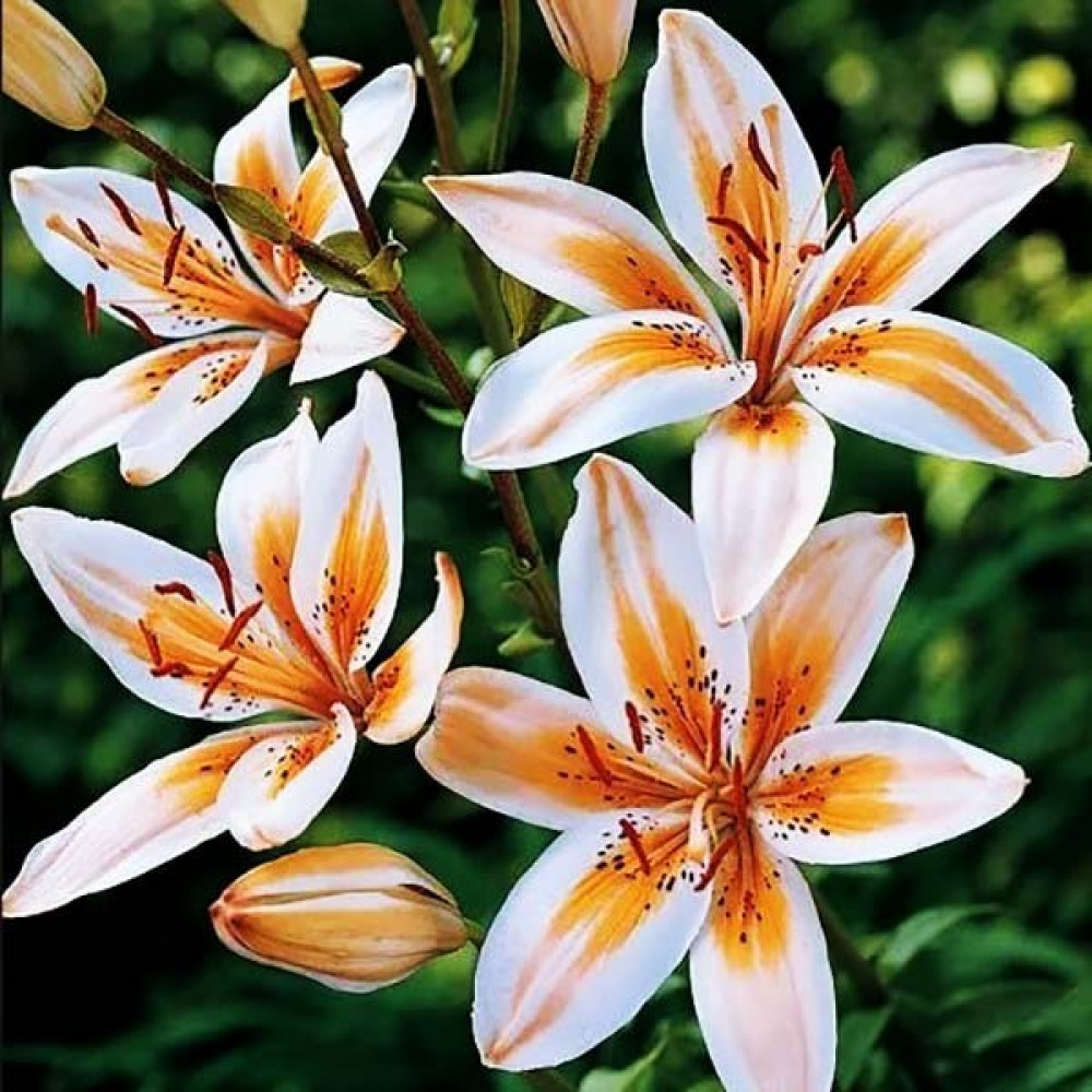 Эта лилия – азиатский гибрид, подкупающий своей легкой солнечной расцветкой. Цветы с яркой, апельсиново-рыжей окраской у горла и по центру лепестков, с широкой белой каймой по краю. Усыпаны темными крапинами. Диаметр цветка крупный. Цветки направлены вверх.
