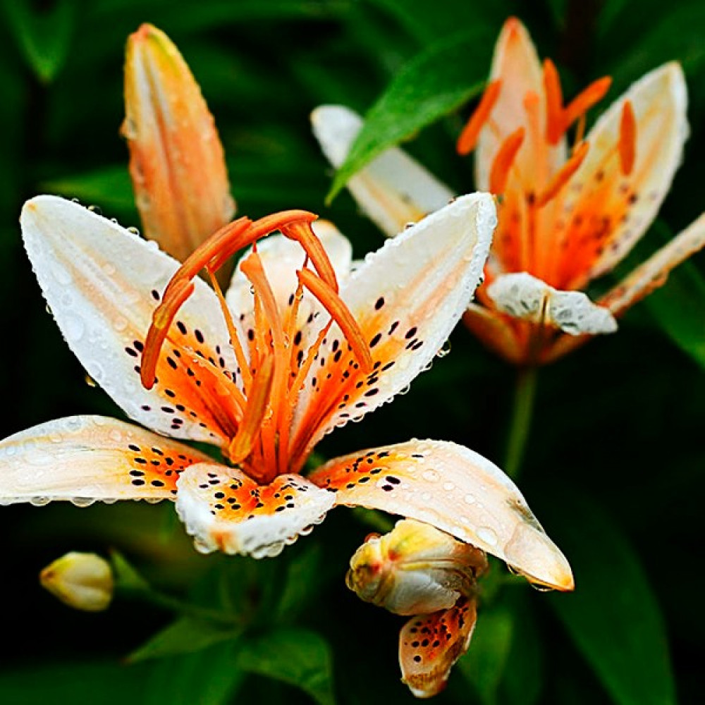 Подготовка к зиме: Нужно укрывать лилии на зиму или нет – зависит от сорта и климатических условий. В случае с азиатскими сортами осенью достаточно просто замульчировать гряды смесью торфа и опилок или хвои, предварительно удобрив посадки перепревшим компостом или перегноем. В случае, если лилии не отличаются морозостойкостью или выращиваются в суровых погодных условиях, процесс выкапывания луковиц производится поэтапно: сначала подрезаются стебли луковиц, затем нужно выкопать луковицы из заранее увлажненной почвы, весь грунт с них нужно аккуратно стряхнуть. Следует внимательно осмотреть луковицы – не подгнили ли корни, нет ли высохших чешуек, затем их промывают под проточной холодной водой, чистые луковицы помещают на полчаса в дезинфицирующий раствор (в марганцовку или «Карбофос», «Максим»), затем луковички выкладывают для просушивания. И только после проведения всех вышеописанных процедур, луковицы лилий готовы для закладывания на хранение.
