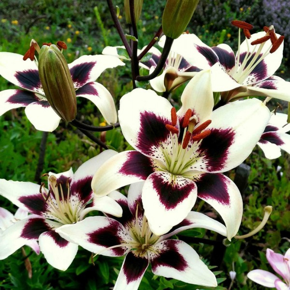 Одна из лучших представителей группы Азиатские лилии. Гибридного происхождения. Ее название звучит в переводе как «Гордость Патрисии». Это прекрасная лилия имеет аккуратные цветки звездчатой формы. Они направлены вверх. Базовый окрас цветков нейтральный кремовый цвет с белым отливом. Дополняют его темно-бордовые широкие мазки с небольшим количеством пятнышек, которые окружают серединку. Благодаря своей окраске, этот сорт легко сочетается с другими растениями на клумбе. Лепестки загнуты. Со временем лепестки выгорают. Эта лилия слегка душиста. Тычинки длинные, красного цвета с тяжелыми оранжевыми пыльниками.