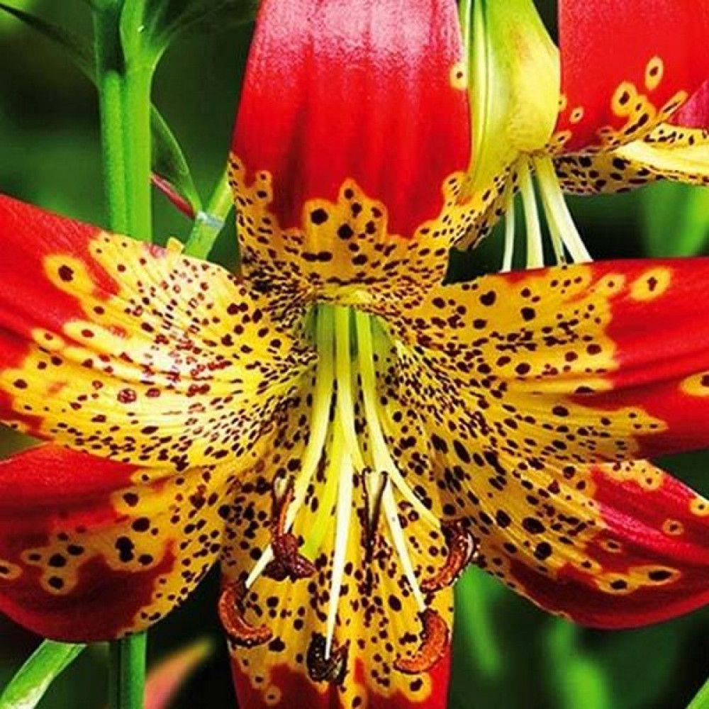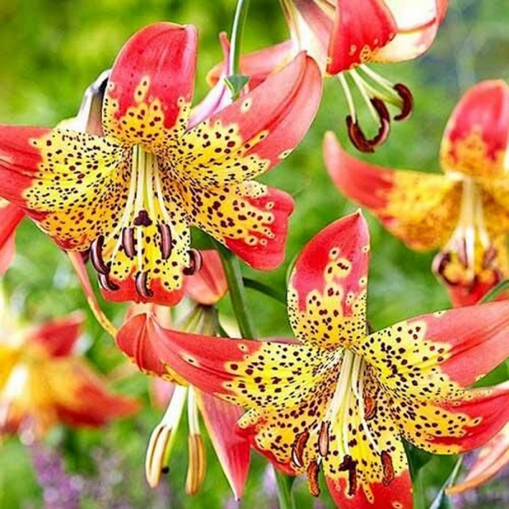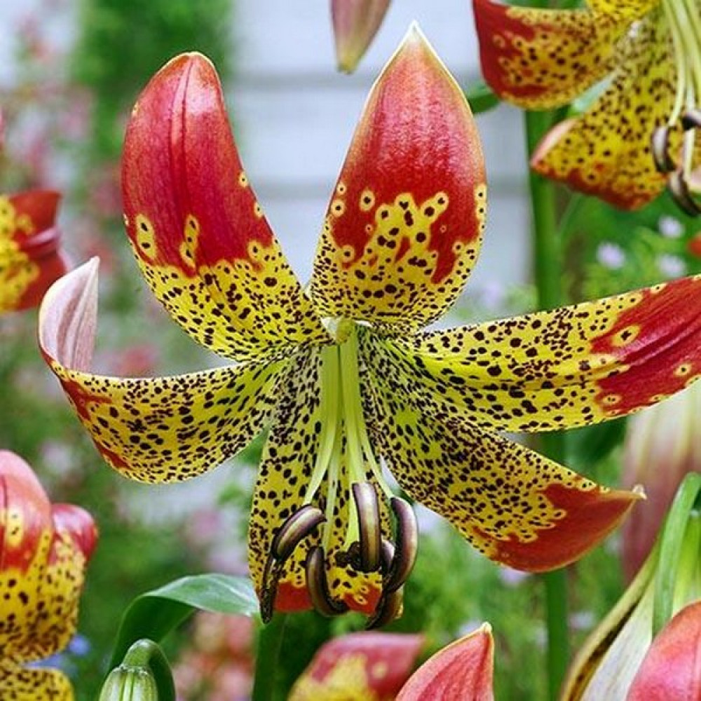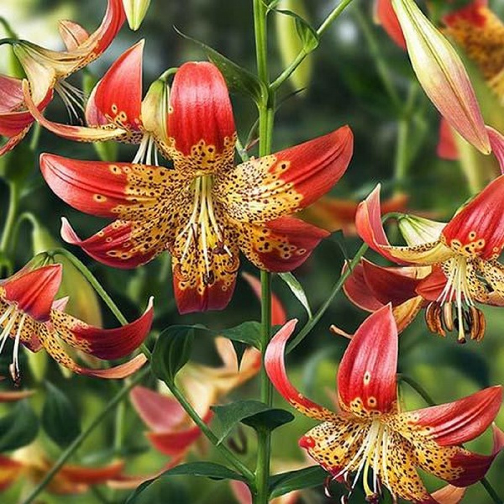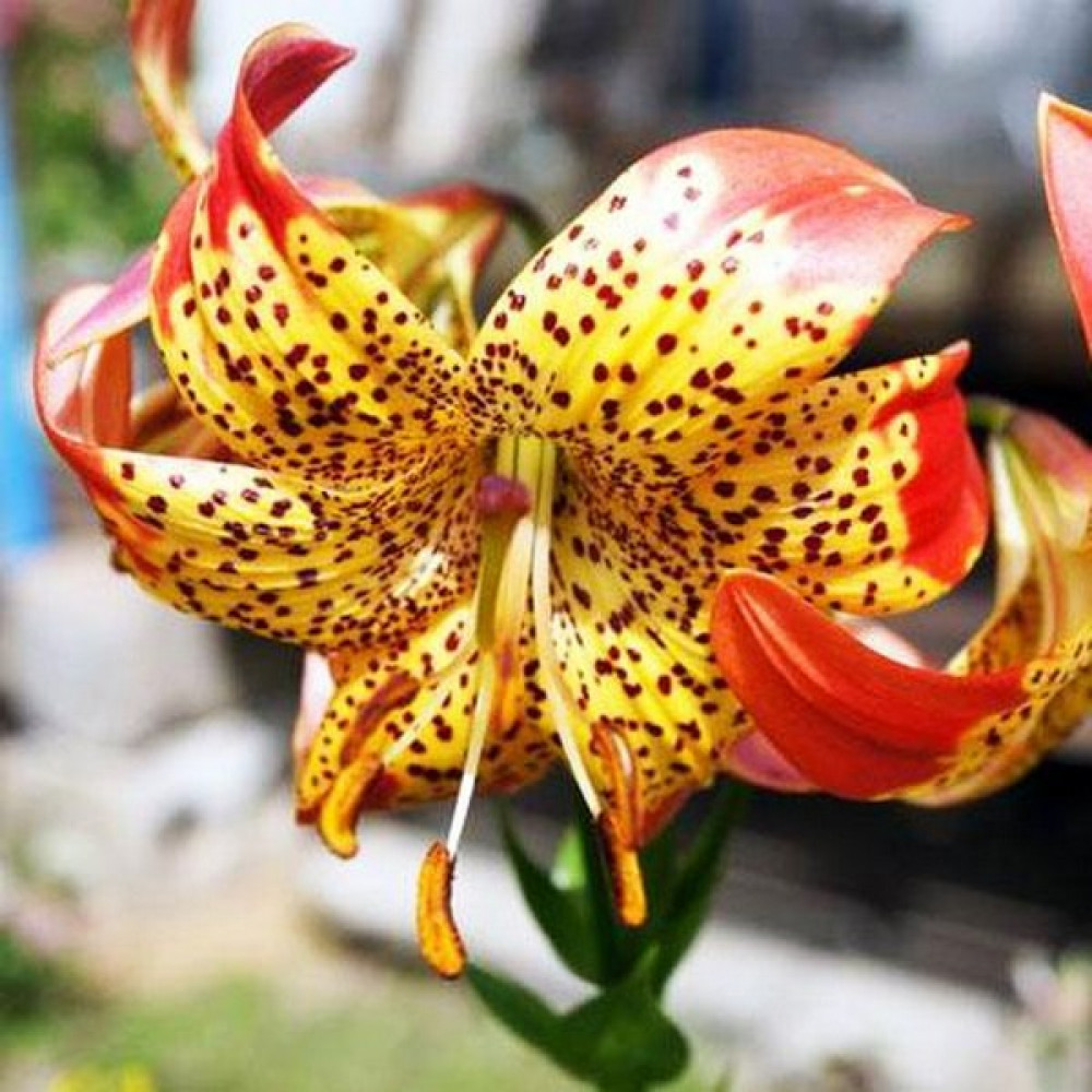 Этот вид отличается своими поникшими вниз цветками. Цветки смотрятся необычно из-за чалмовидной формы, с загнутыми волнистыми лепестками, и эффектными длинными тычинками. Окрас цветков ярко-желтый с крупным частым темно-бордовым крапом и красно-оранжевыми кончиками. Аромат насыщенный, сильный.