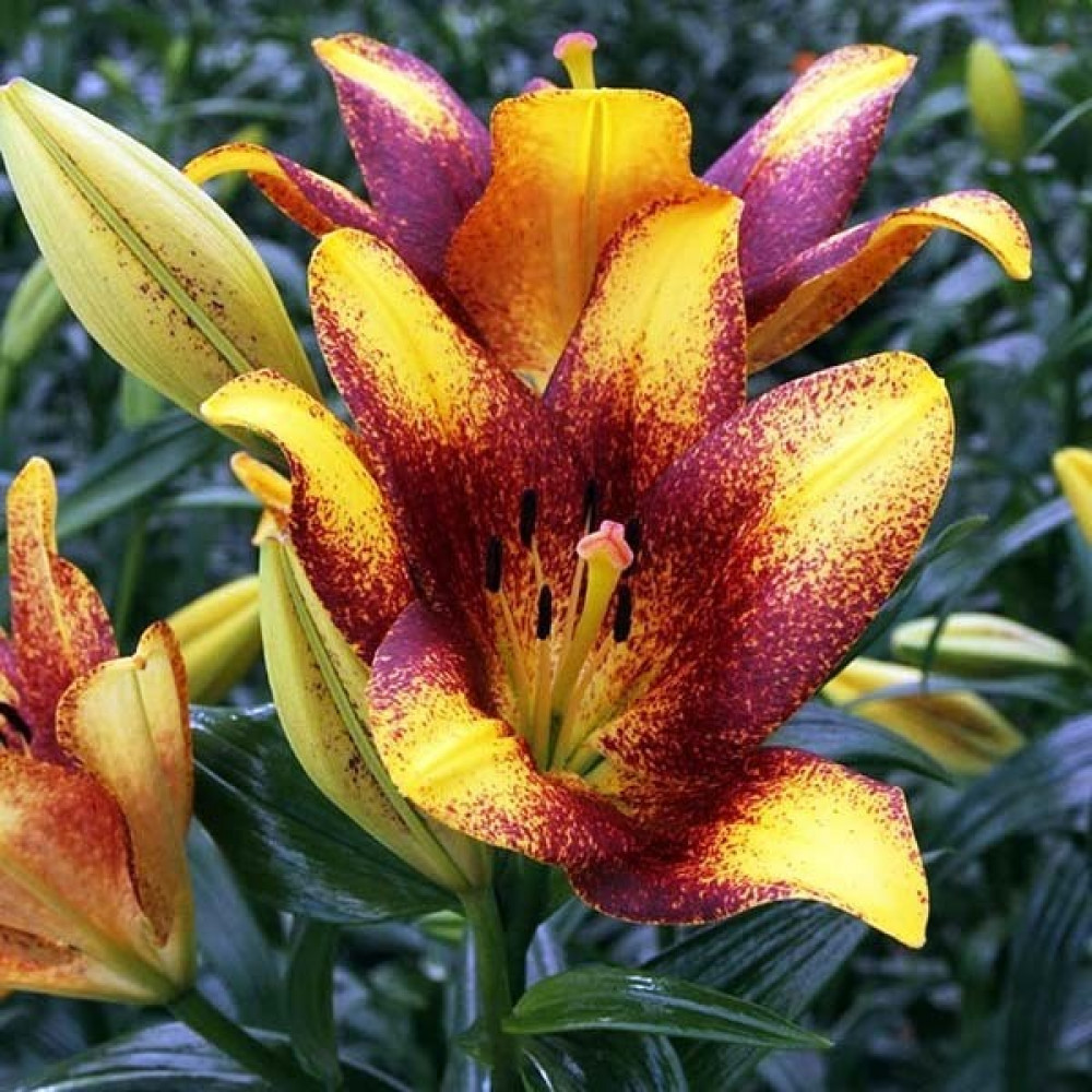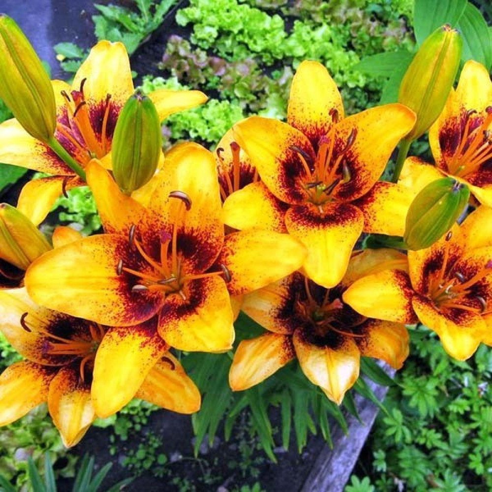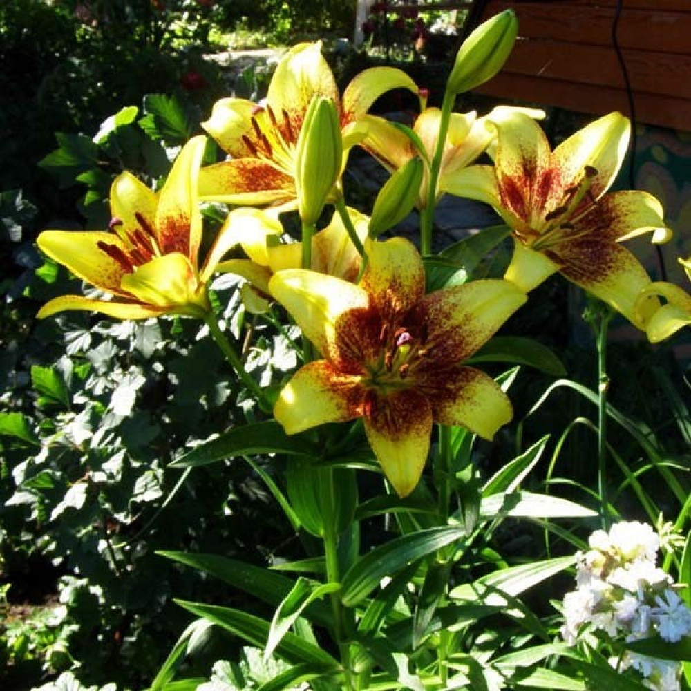 Это очень пышный сорт, который дает до 20 бутонов на одном стебле через 2-3 года после посадки. Цветет очень долго, до 4-х недель, а также долго сохраняется в срезанном виде, не темнея и не осыпаясь. Цветы роскошные, яркого желто-оранжевого цвета, со светло-коричневым крапом.