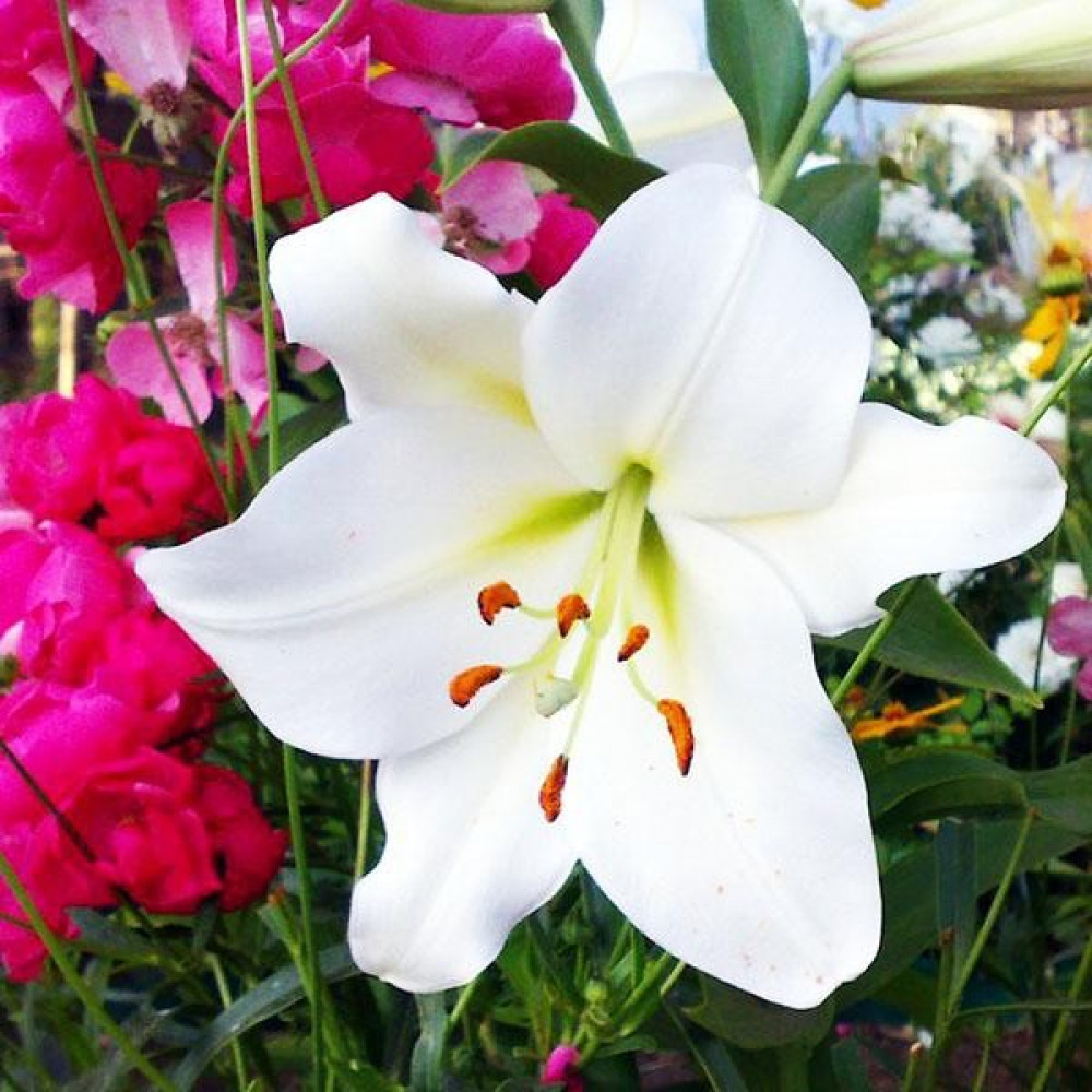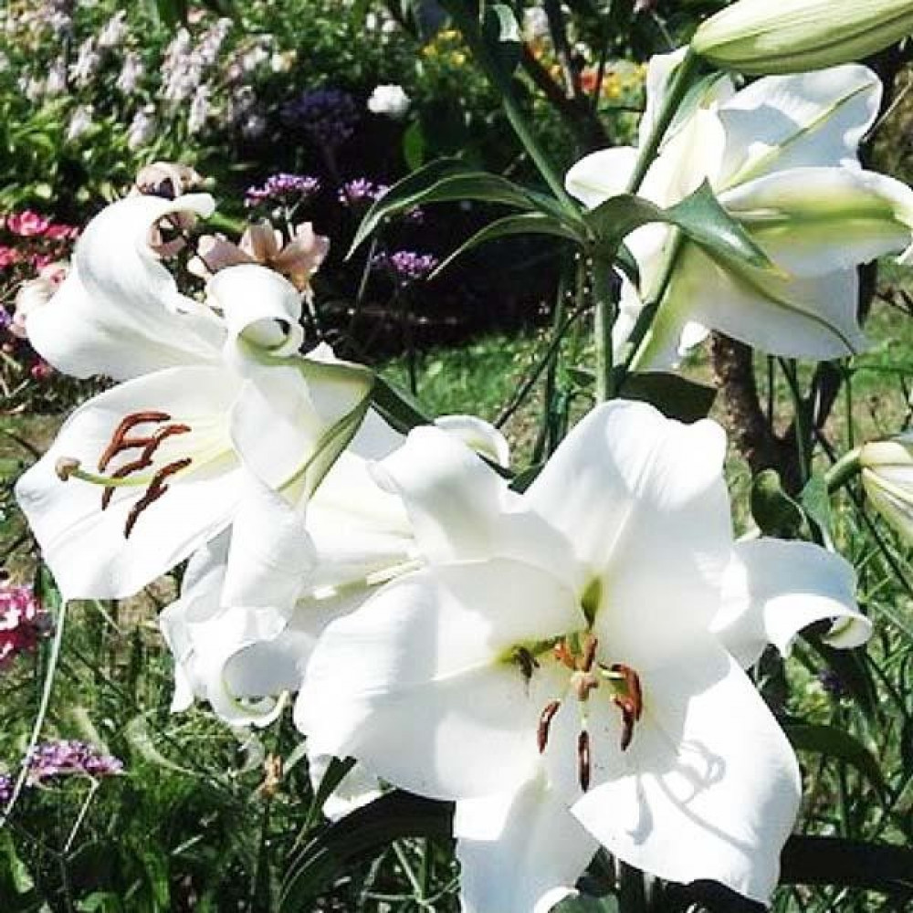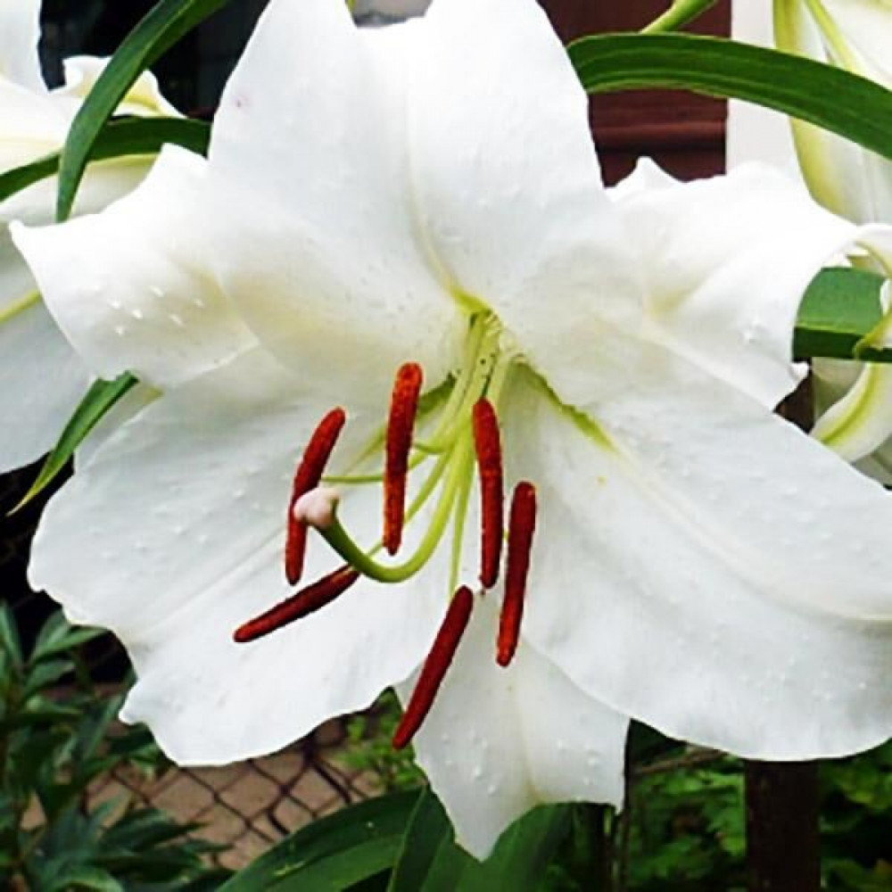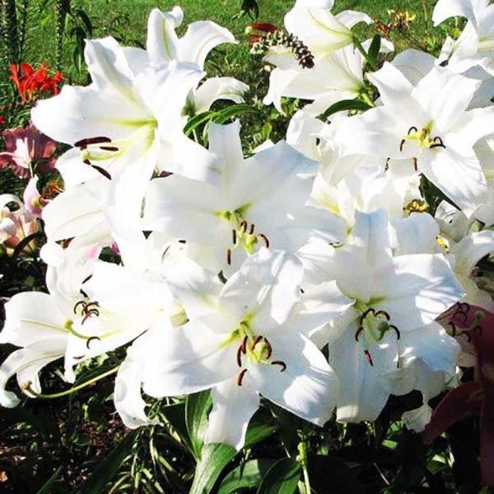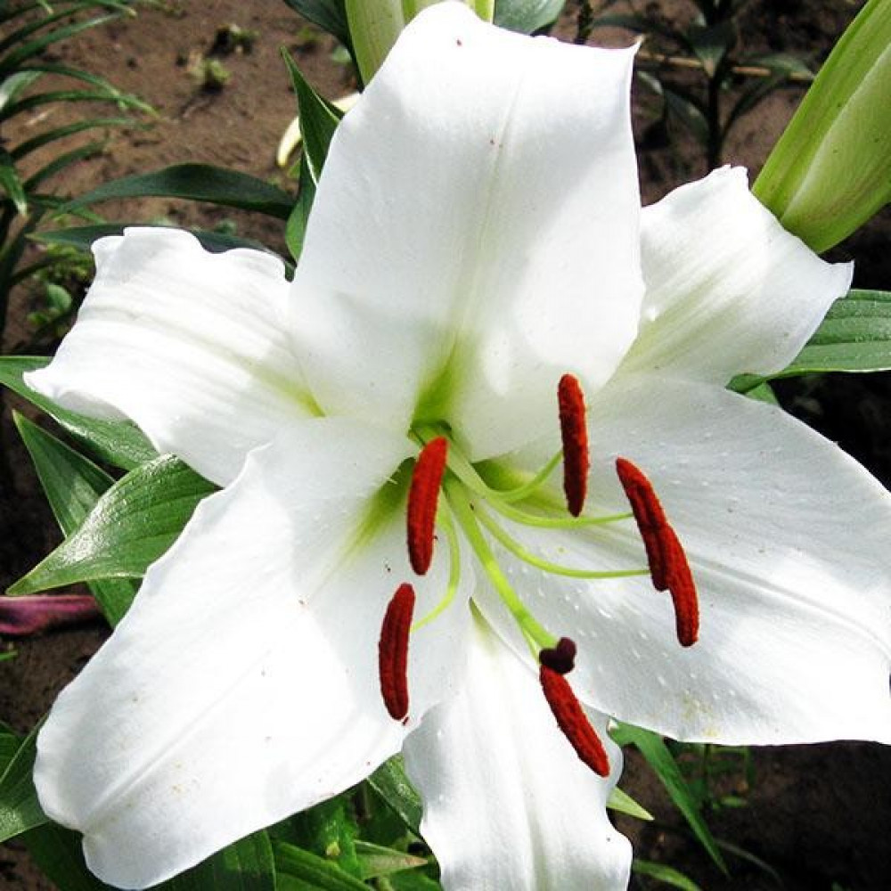 Шикарная лилия с огромными белоснежными ароматными цветками! Форма широковоронковидная, с загнутыми кончиками лепестков. Нектарники зеленые с переходом в желтые, пыльники коричневые, рыльце серо-зеленое. Фактура плотная. В соцветии развивается до 5-7 бутонов, направлены в стороны. Используется для составления букетов высокого качества.
