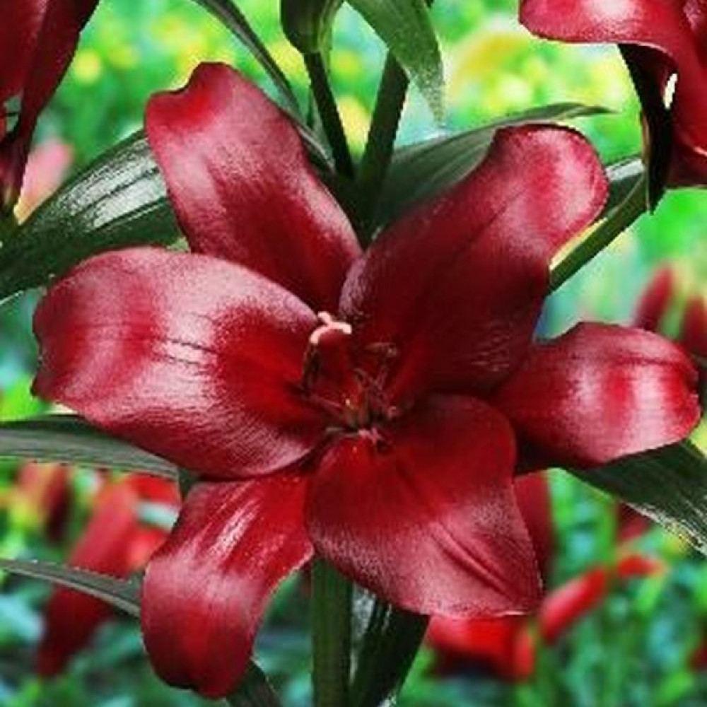 Очень глянцевый темно-бордовый, листва глянцевая. Высота 120 см, диаметр цветка до 17 см, размер луковицы 12/14.