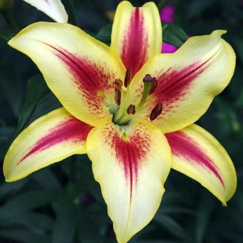 | Период цветенияиюль-август | Стандарт поставкиЛуковица в торфе | Цвет цветкасветло-желтый, ярко-розовые стреловидные мазки |