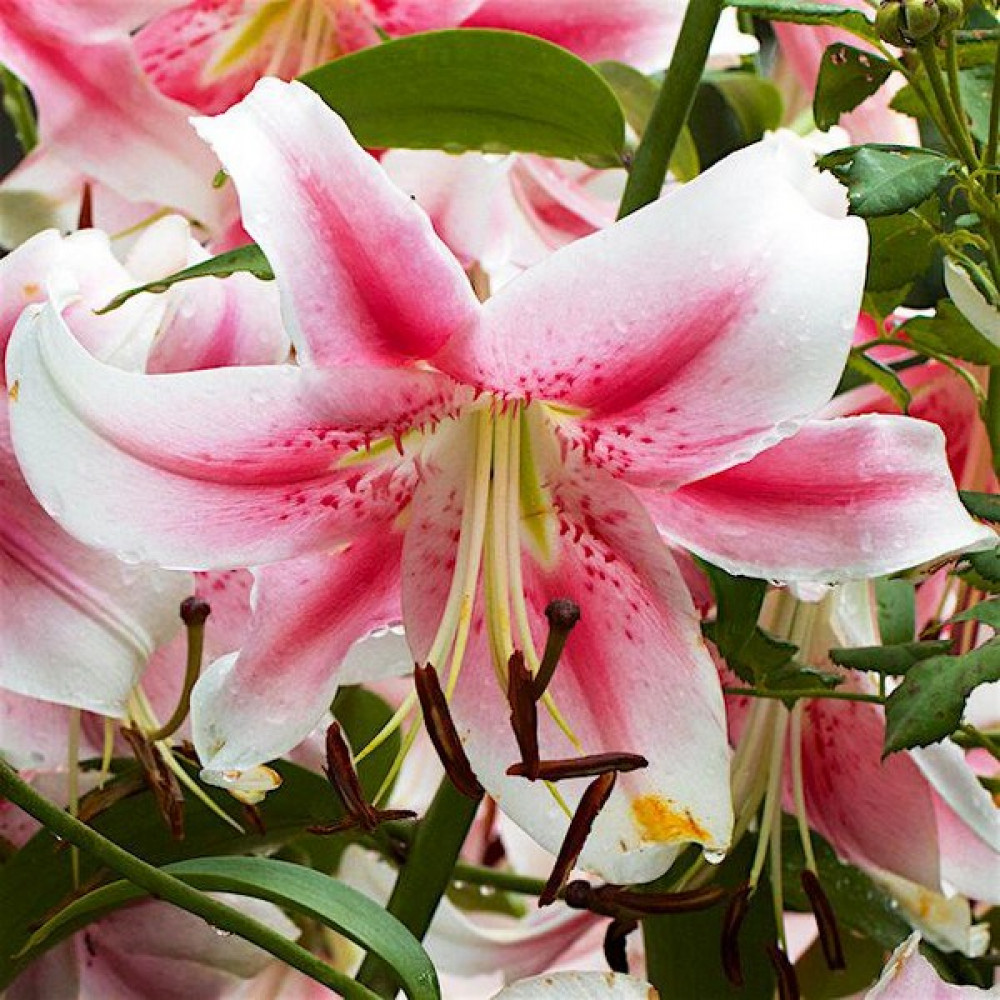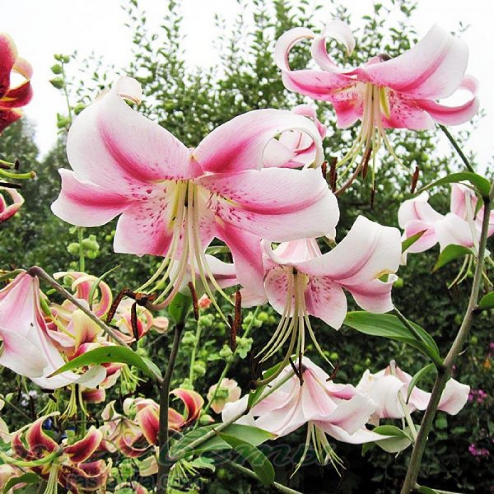 Цветки очень крупные. Форма цветов воронковидная или чашевидная. Растут они вниз или немного в сторону. Расцветка у этих лилий нежно-розовая (при холодной погоде она более насыщенная) с малиновым крапом и белой окантовкой. Все цветки немахрового типа. Лепестки волнистые, закручены наверх. Данные цветы обладают ярко выраженным сладковато-пряным запахом. Стоит отметить, что эти лилии довольно долго сохраняют свою свежесть после срезки.