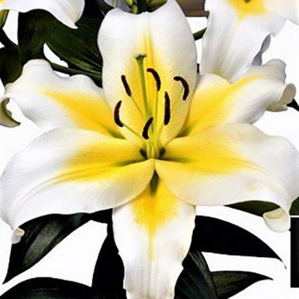 Шикарная лилия, цветы крупные, ароматные, белоснежные с ярко-желтой звездочкой в центре, лепестки слегка отогнуты назад. На одном крепком стебле может образовываться до 12 цветков.
