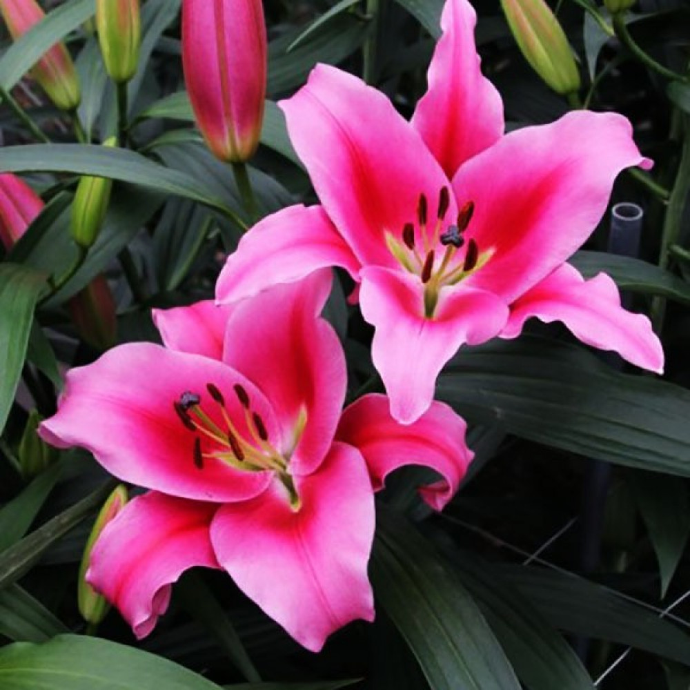 Лилия ОТ гибрид Dalian (Далиан) - имеет большие цветки с махровыми лепестками малинового оттенка. Центр цветка - ярко желтый. Аромат интенсивный. Стебли высокие, густо покрыты темно-зелеными листьями. Для оптимального внешнего вида рекомендуется высаживать группами до 5 луковиц, нуждается в опоре.