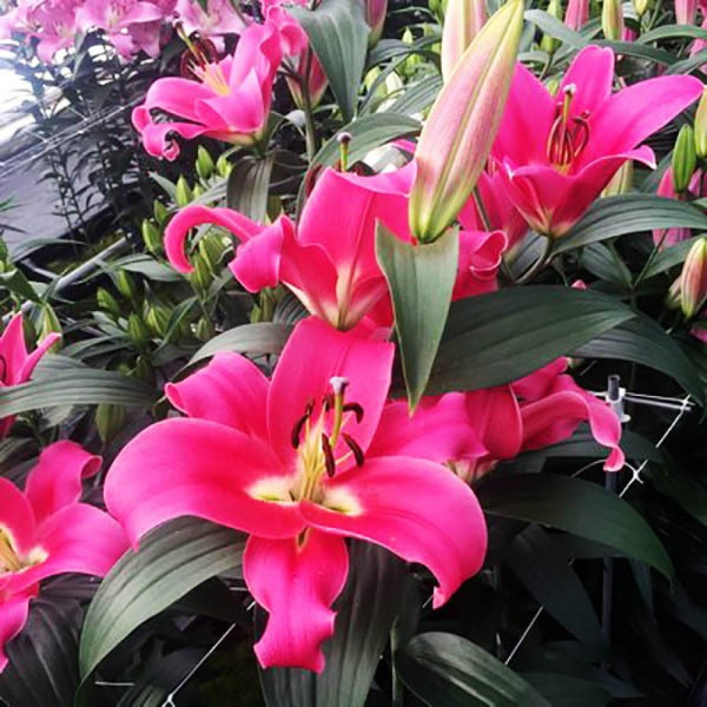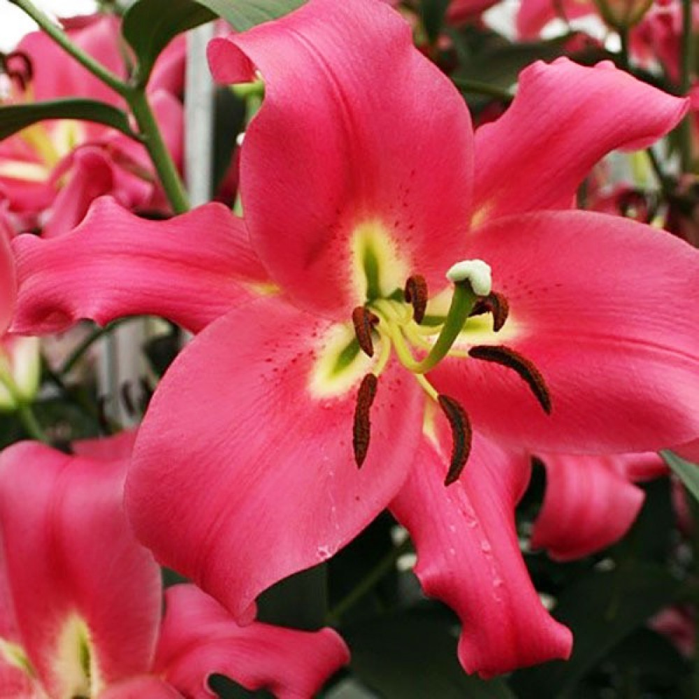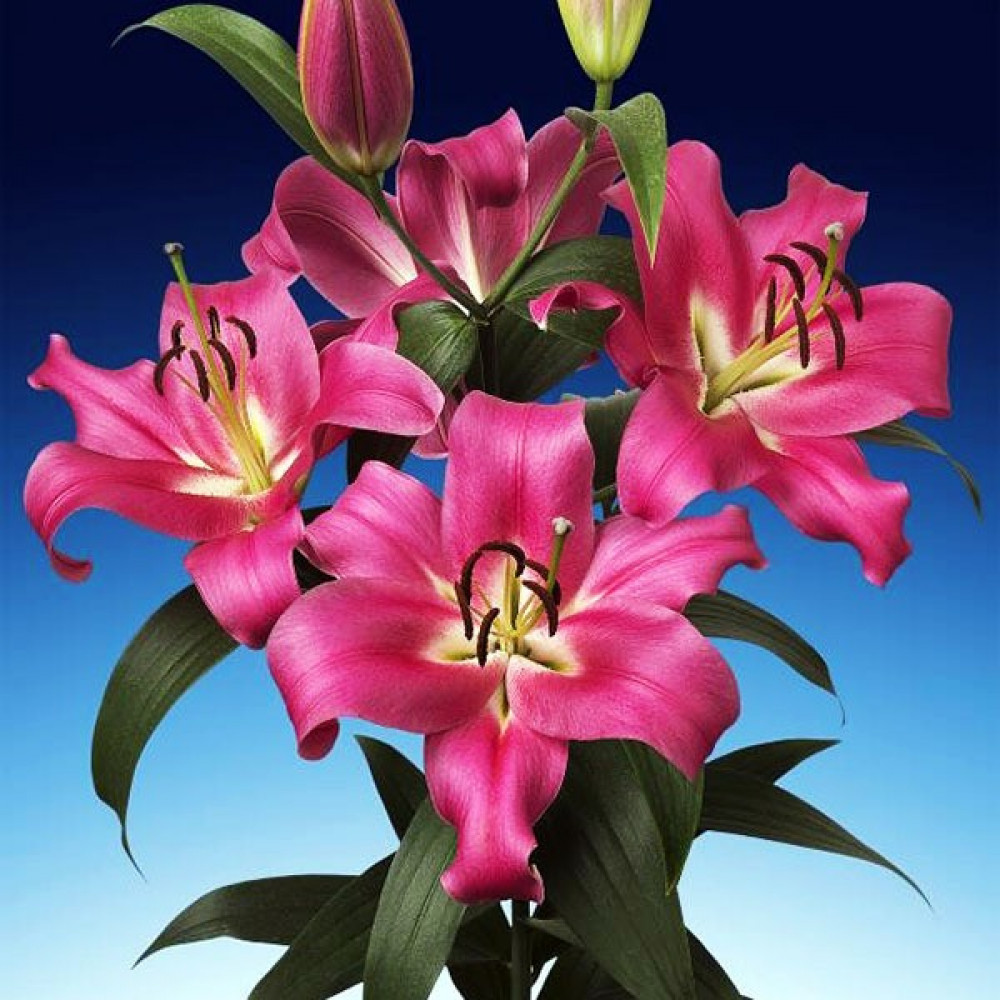 Высокорослый сорт с очень крупными цветками. Лепестки имеют насыщенную окраску цвета фуксии с более светлым центром и коричневыми пыльниками. Цветки смотрят вверх.