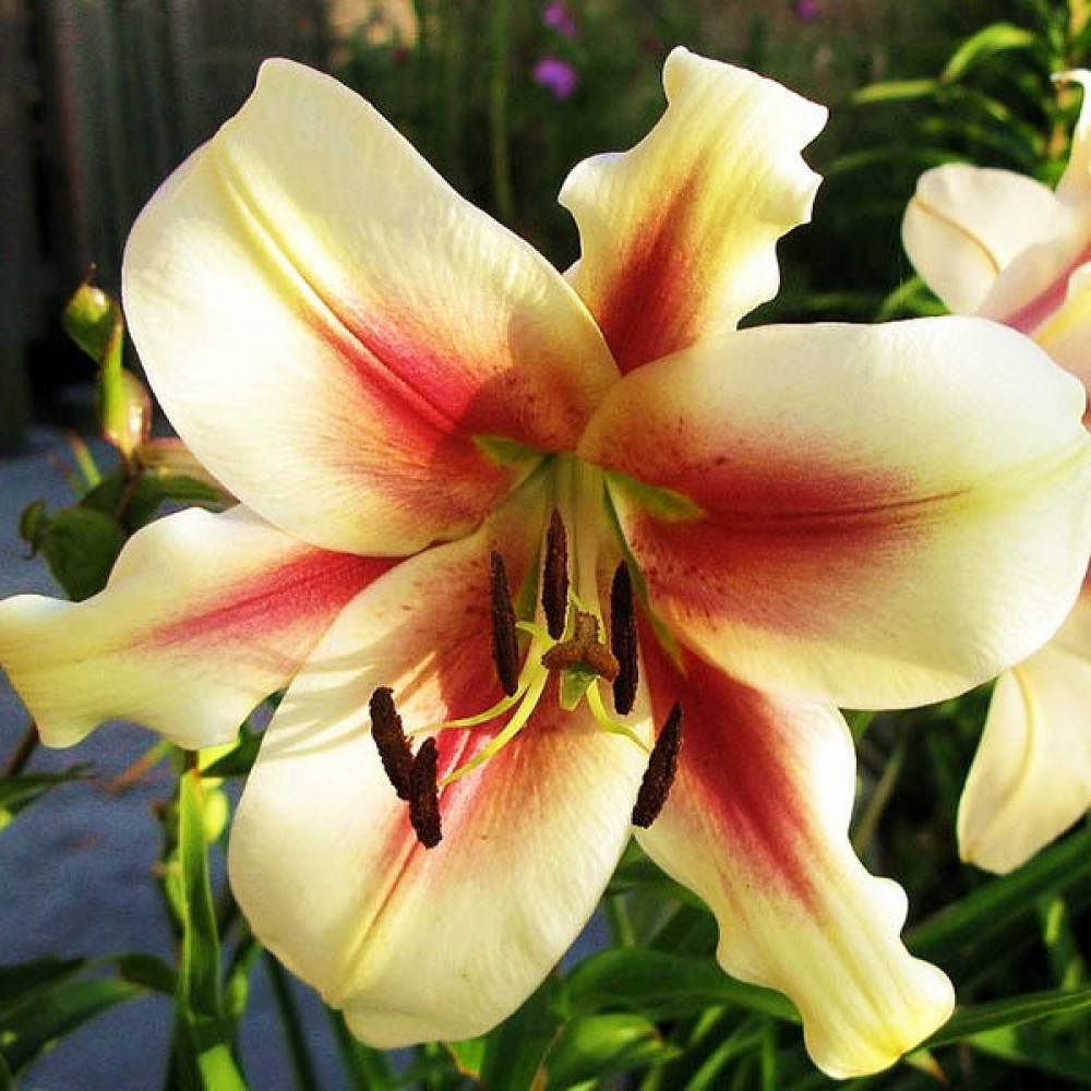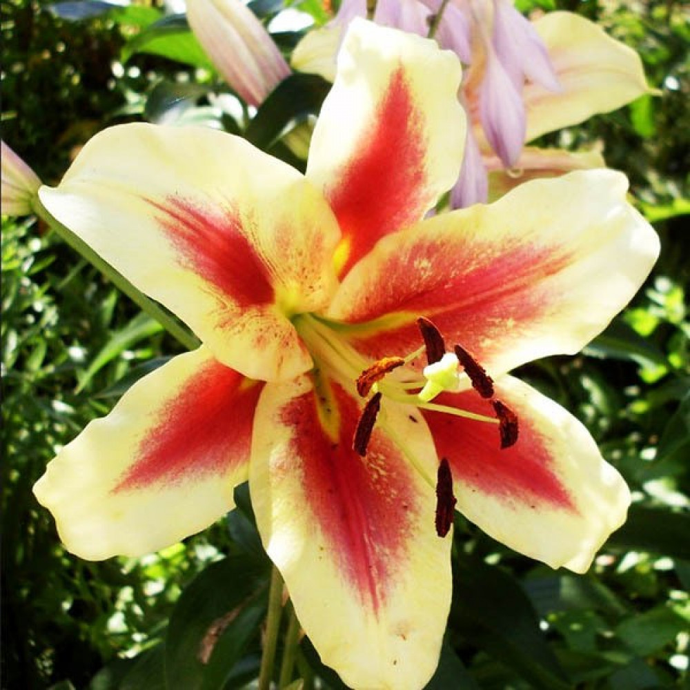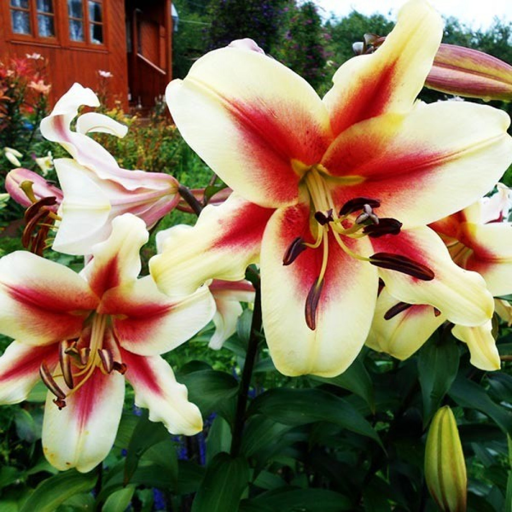 Изящная лилия! Цветки со сливочно-желтыми лепестками и красными мазками от центра. Цветки направлены в сторону. Сорт имеет нежный аромат.