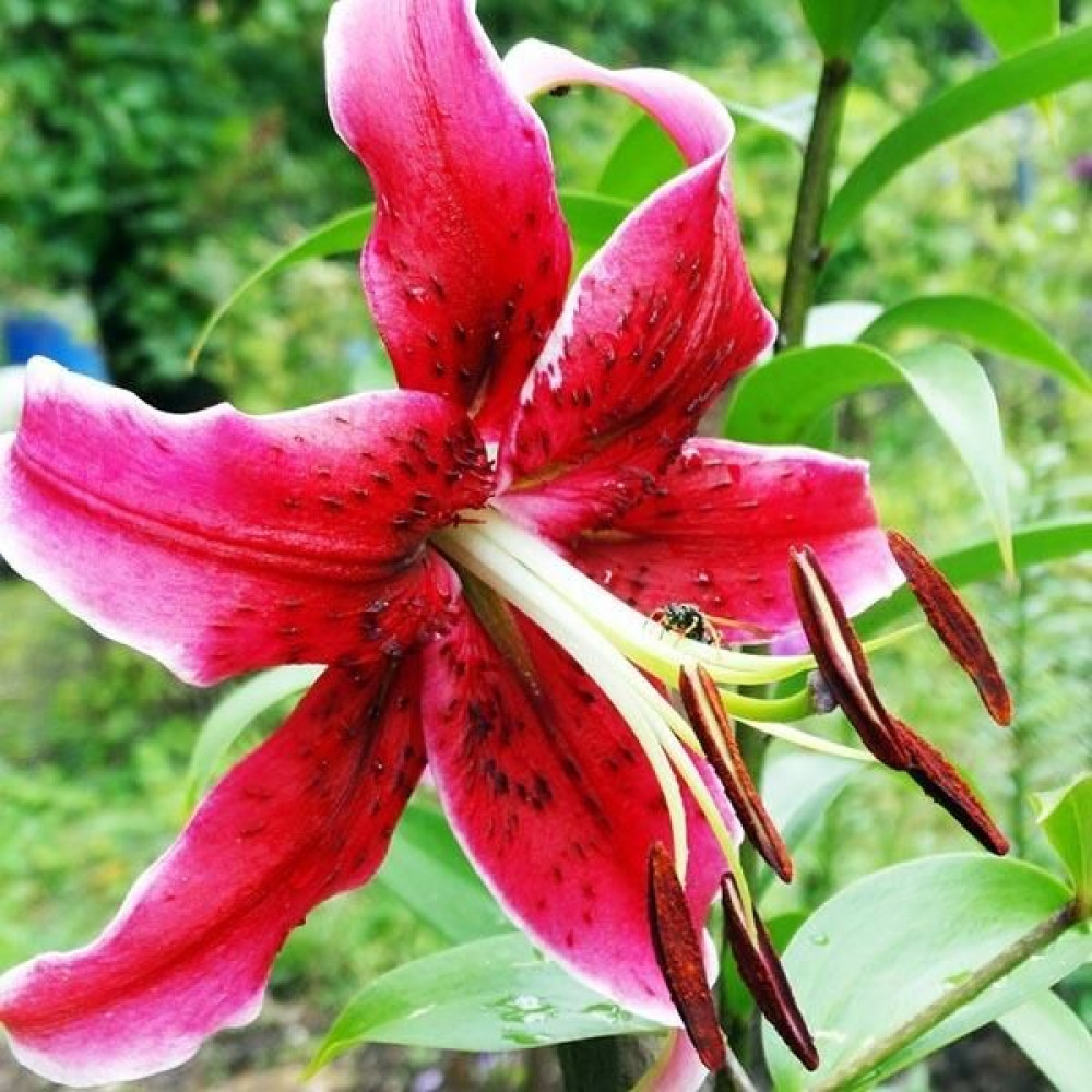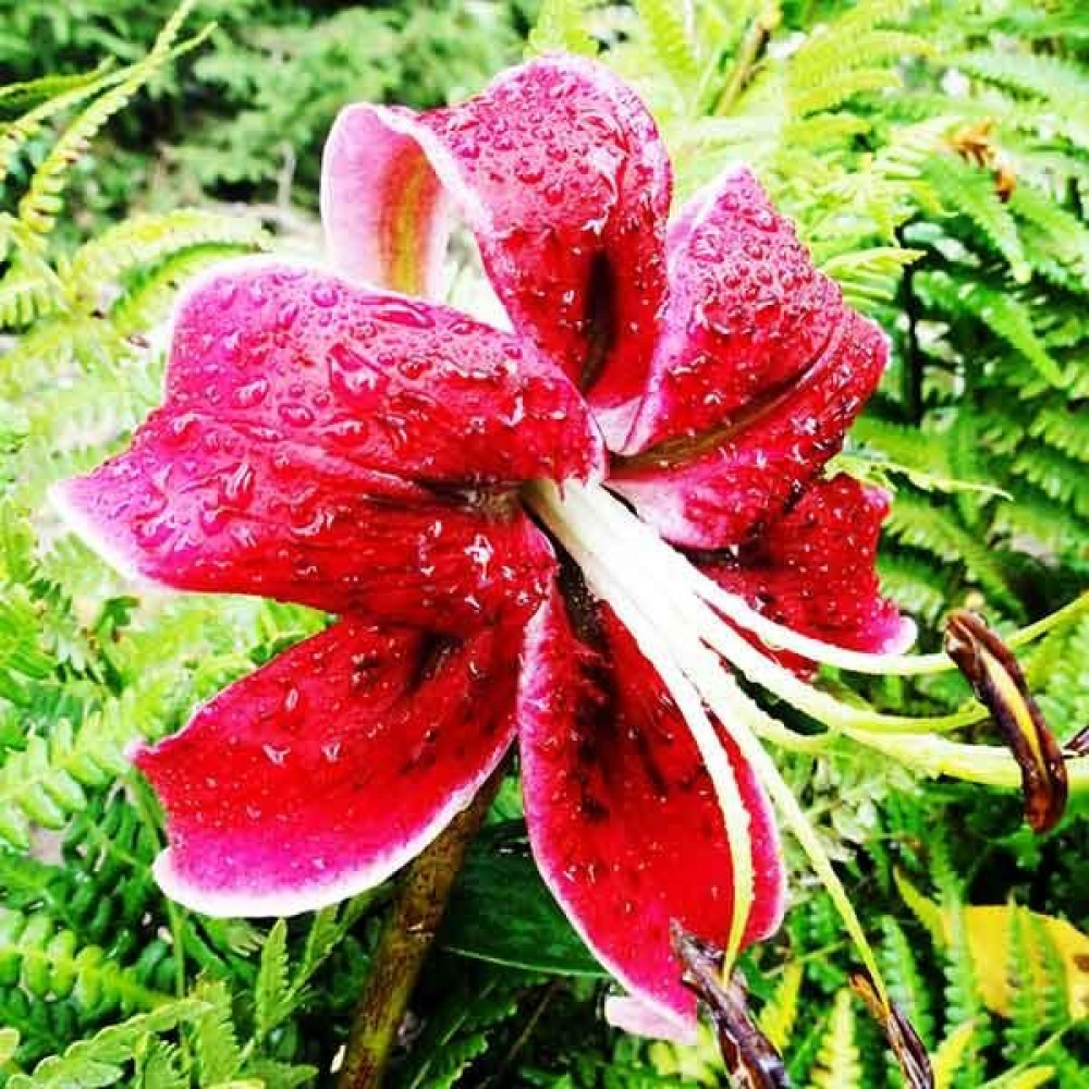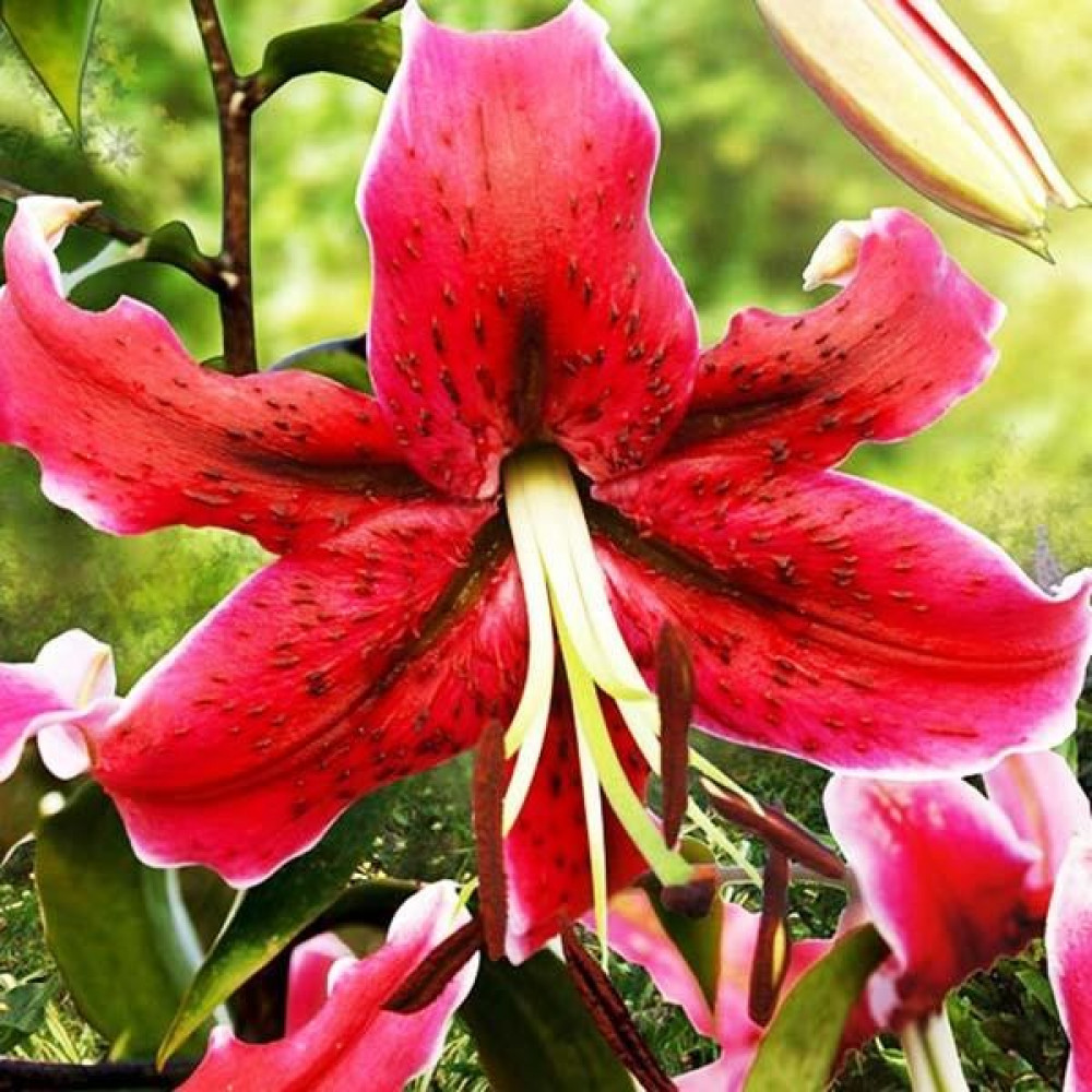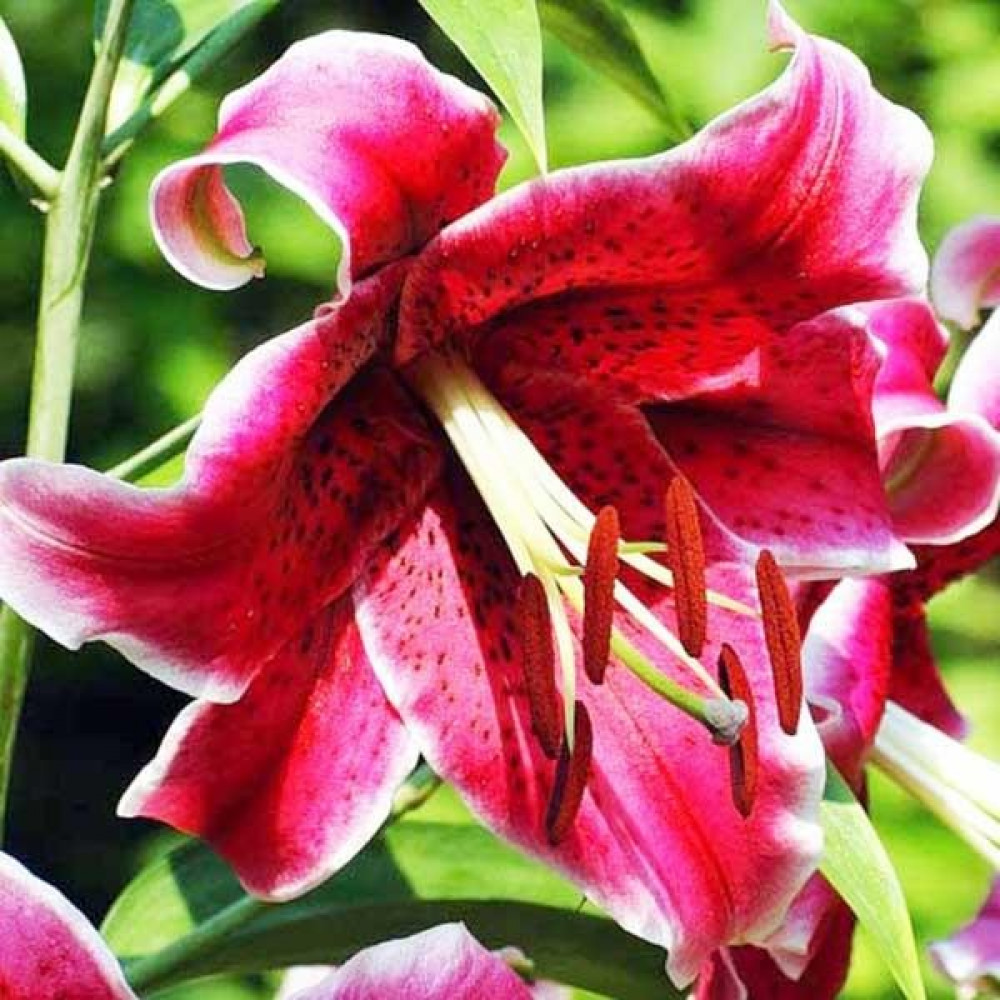 | Период цветенияиюль-август | Стандарт поставкиЛуковица в торфе | Цвет цветкатёмно-красный с тёмным крапом и белой тонкой каймой |