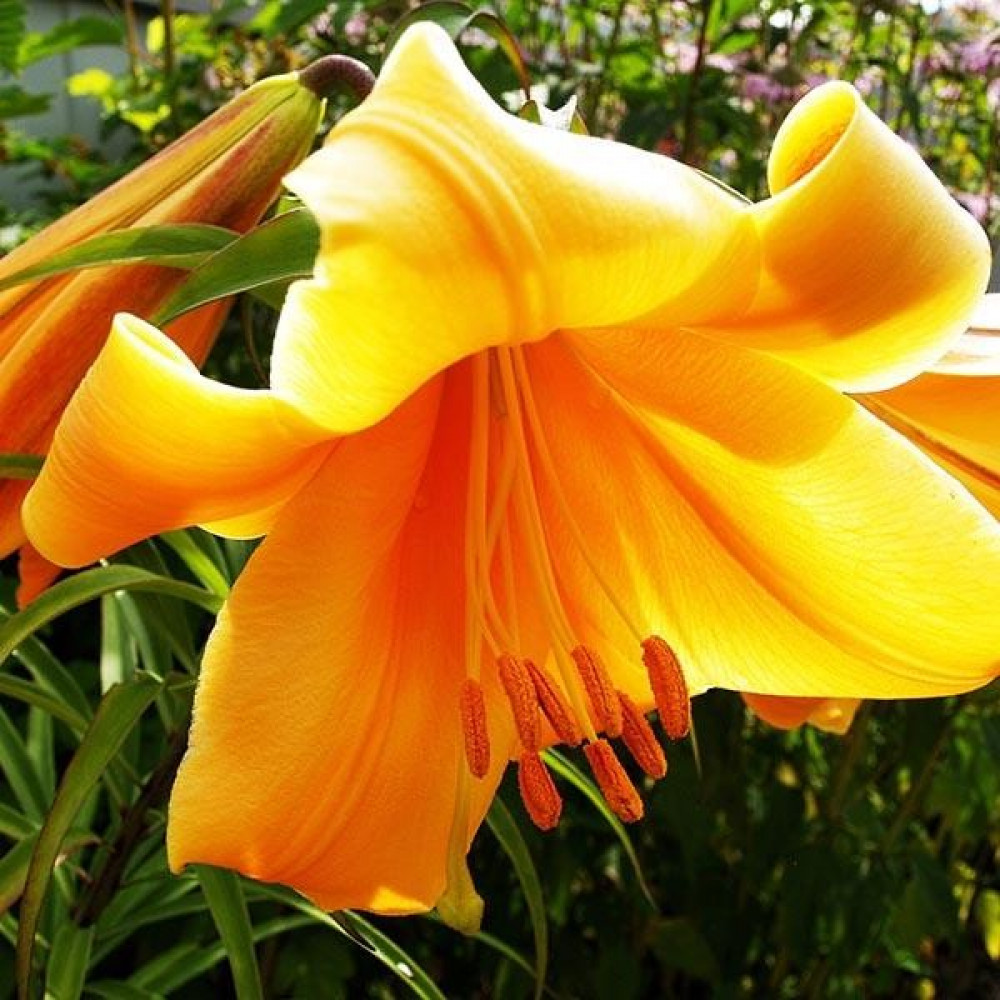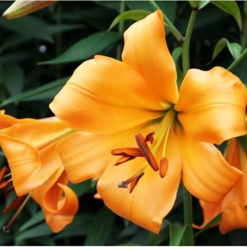 Потрясающая ориентальная лилия украсит ваш сад или букет! Крупные, удлиненные цветки имеют тыквенно-рыжий окрас и сладкий аромат, смотрят вверх. Высота стеблей достигает двух метров. При использовании в букетах рекомендуется срезать пыльники.