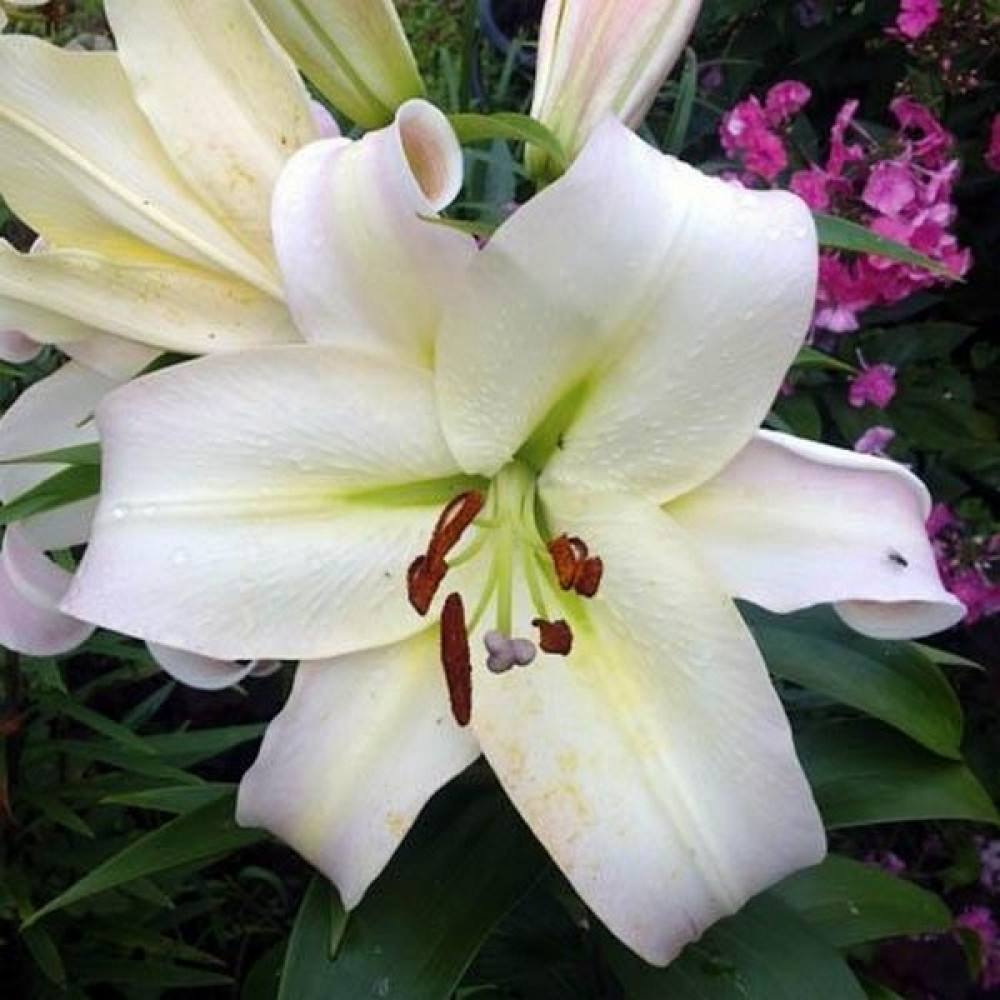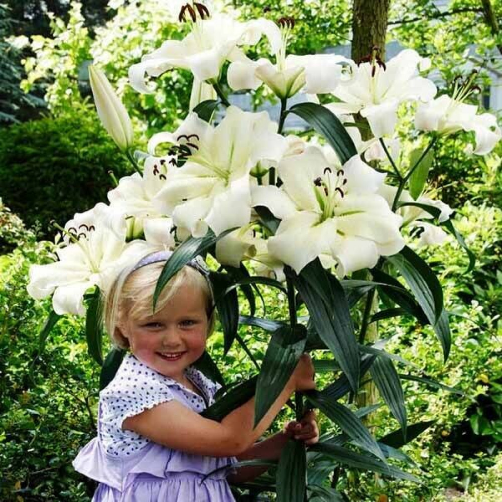 Это гигантская лилия, которую еще называют лилейным деревом. Ее крупные цветки источают чудесный аромат, наполняющий собой сад. Лепестки изящные с кремовым оттенком, с розовым к центру. Перед отцветанием становятся белыми.