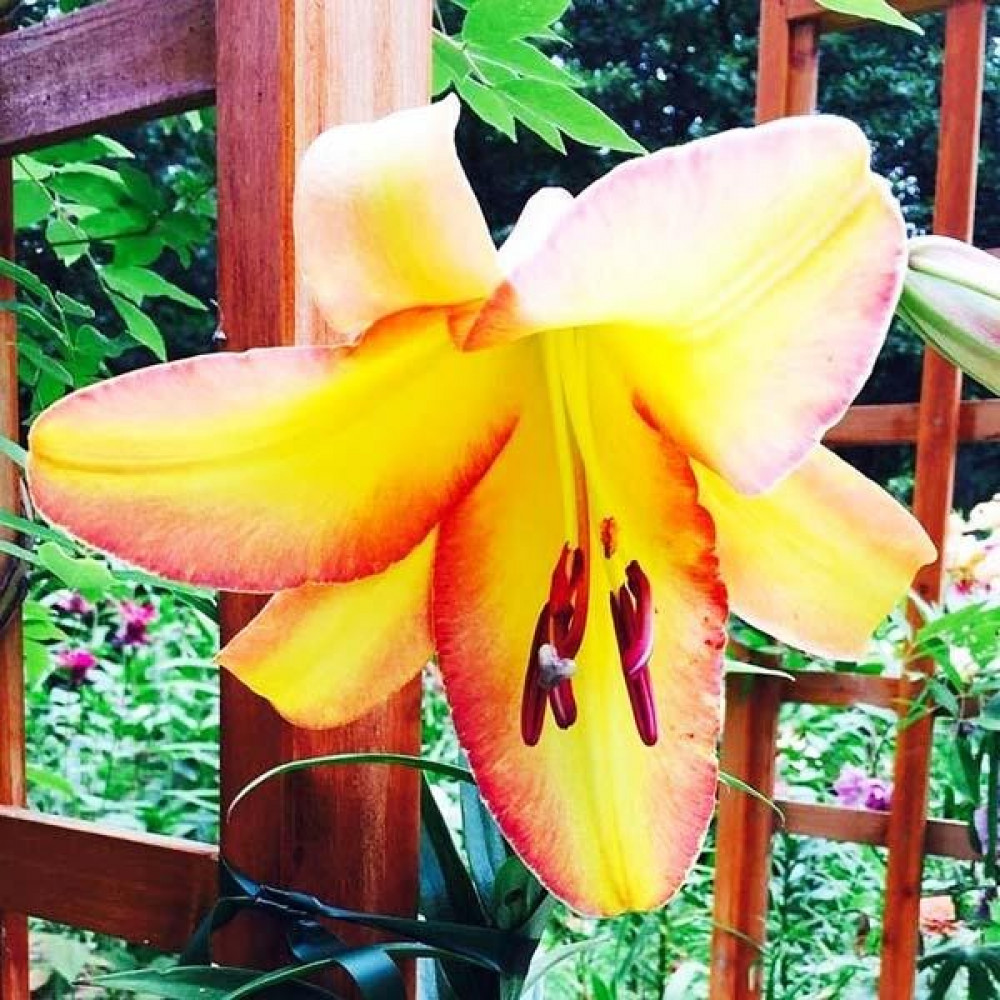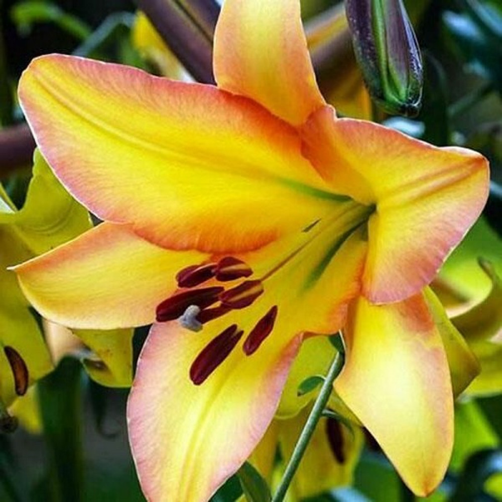 | Период цветенияиюль-август | Стандарт поставкиЛуковица в торфе | Цвет цветкажёлтый с розовой каймой |