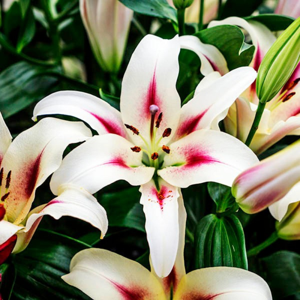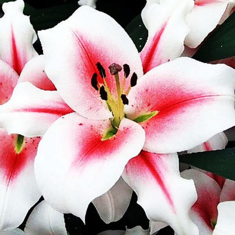 Новый сорт в линейке ОТ гибридов. Цветок белый с красно-малиновыми мазками до середины лепестков и легким напылением у центра. Стебли прочные, жесткие. Очень приятный аромат!