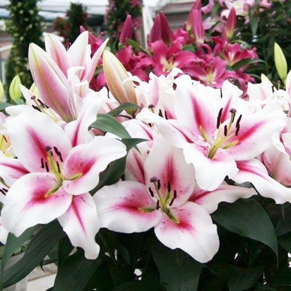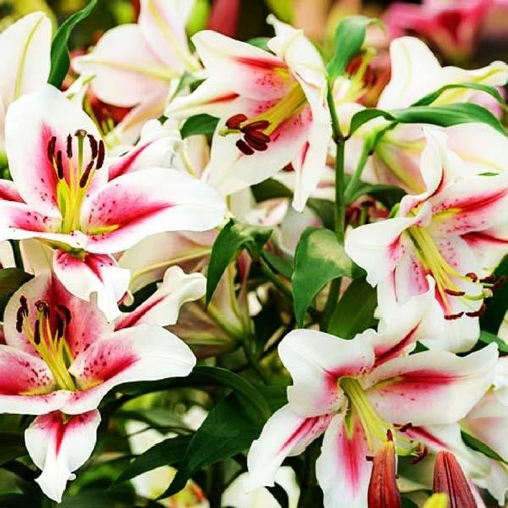 | Период цветенияиюль-август | Стандарт поставкиЛуковица в торфе | Цвет цветкабелый с ярко-малиновыми пятнами |