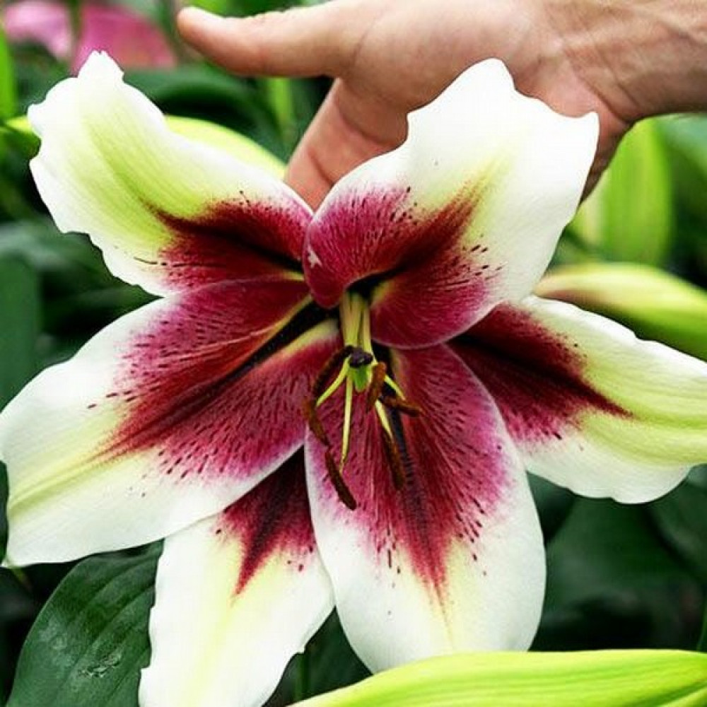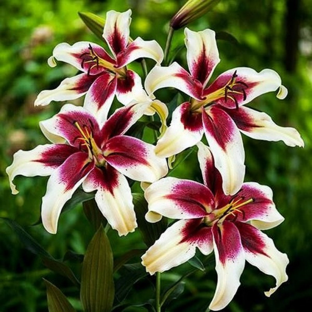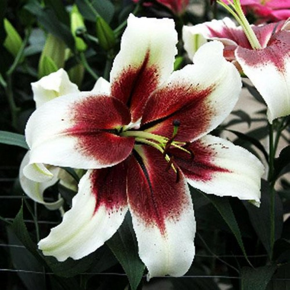 Лилия ОТ гибрид Zeba (Зеба) - Этот фантастически ароматный сорт вырастет до 120 см в высоту. Цветки – цвета слоновой кости с обширным плотным малиново- винно-бордовым пятном в центре. Смотрят вверх и в сторону. Лилия Зеба неприхотлива в уходе, предпочитает, чтобы ее высадили где-нибудь на открытом месте - на солнце или в полутени.