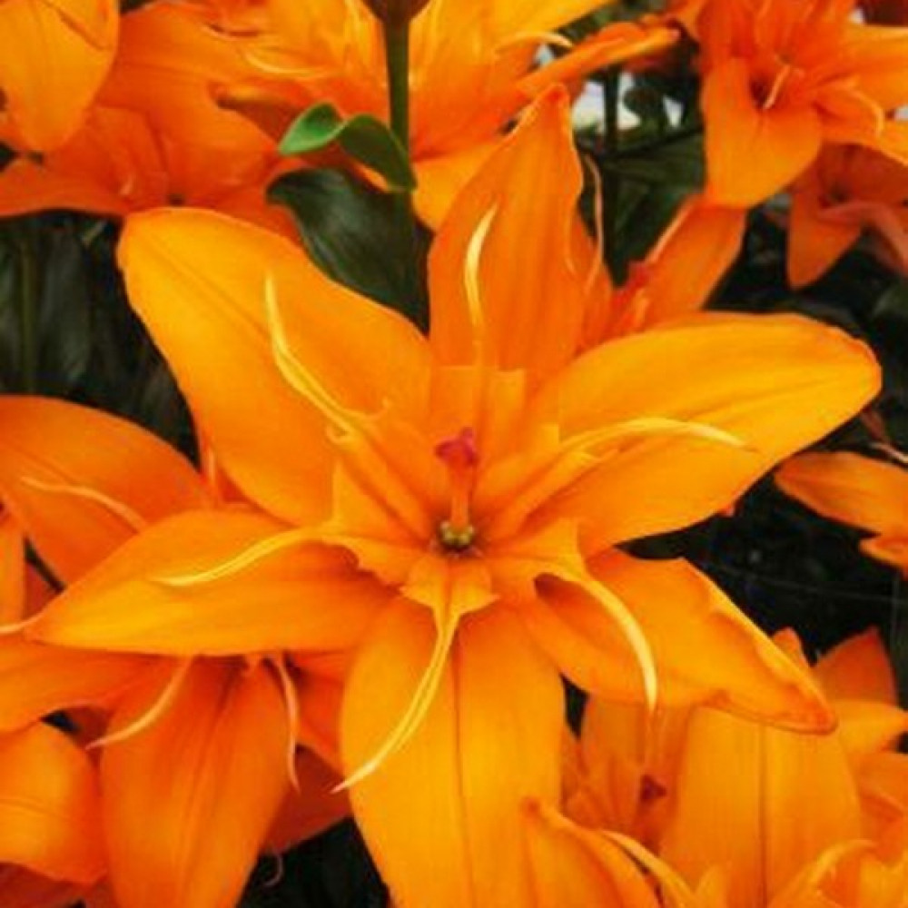 Уникальная НОВИНКА! Махровый, плотный, ярко-оранжевый цвет. Внутренние лепестки оригинальной формы с длинными тонкими кончиками. Высота 100 см, диаметр цветка до 17 см, размер луковицы 12/14.