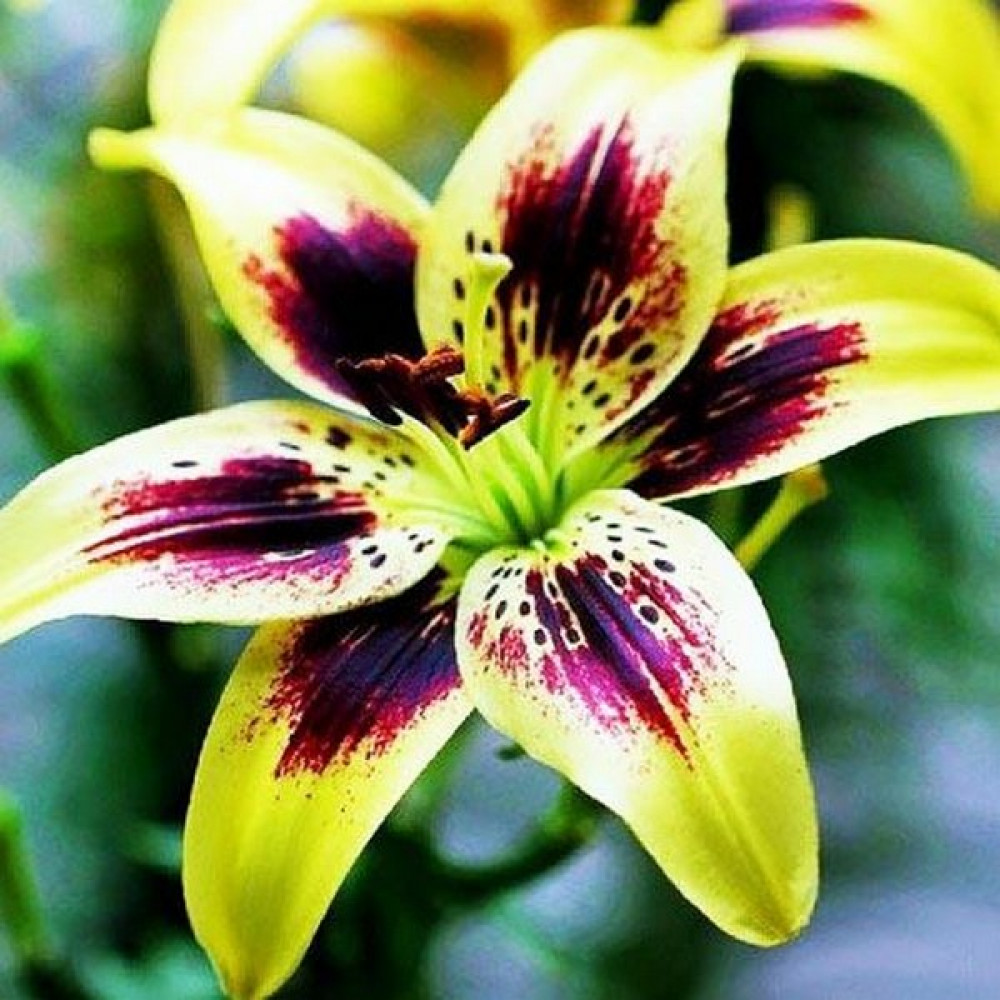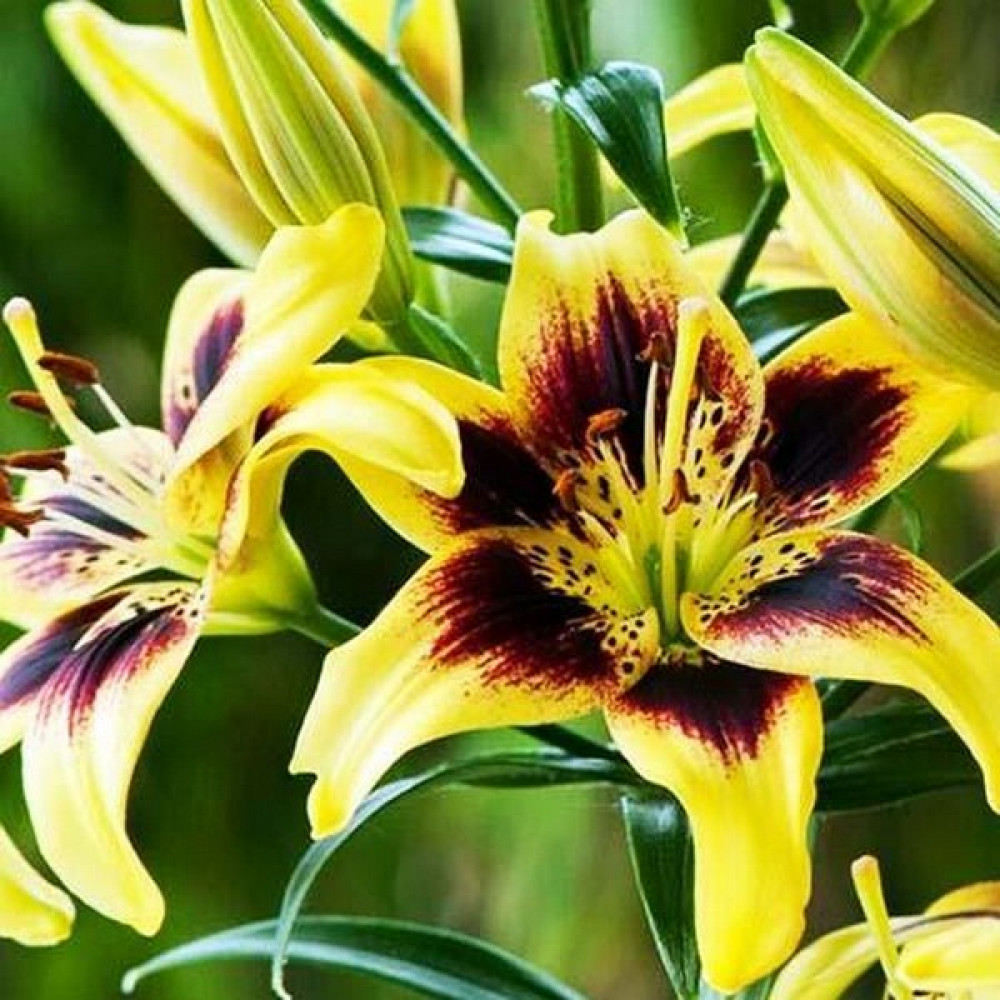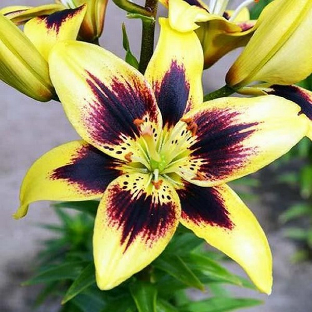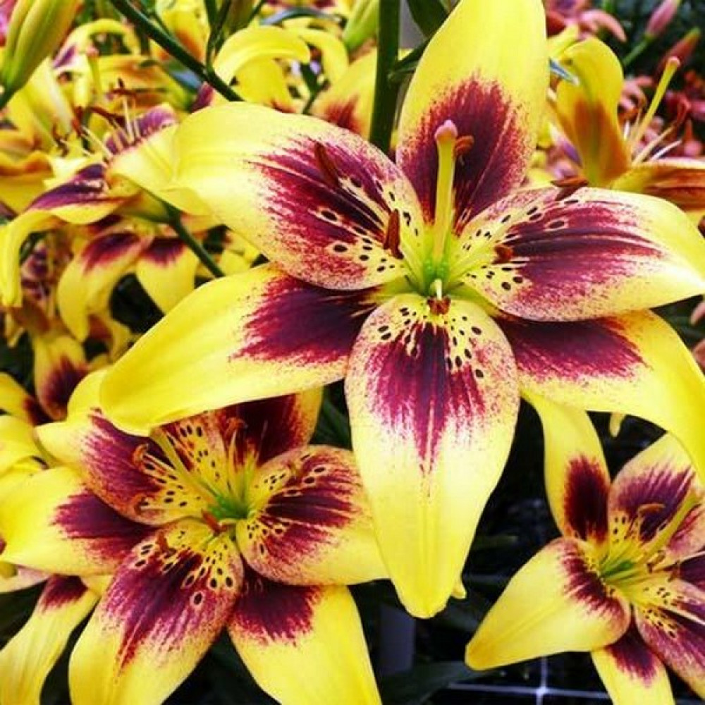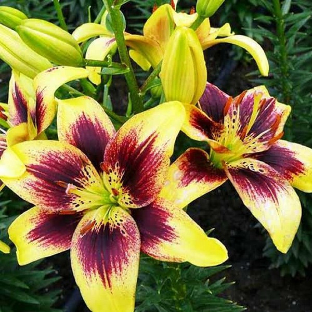 Гибридный сорт с яркими цветками, имеющими солнечный желтый окрас и темно-бордовое пятно в середине каждого лепестка.