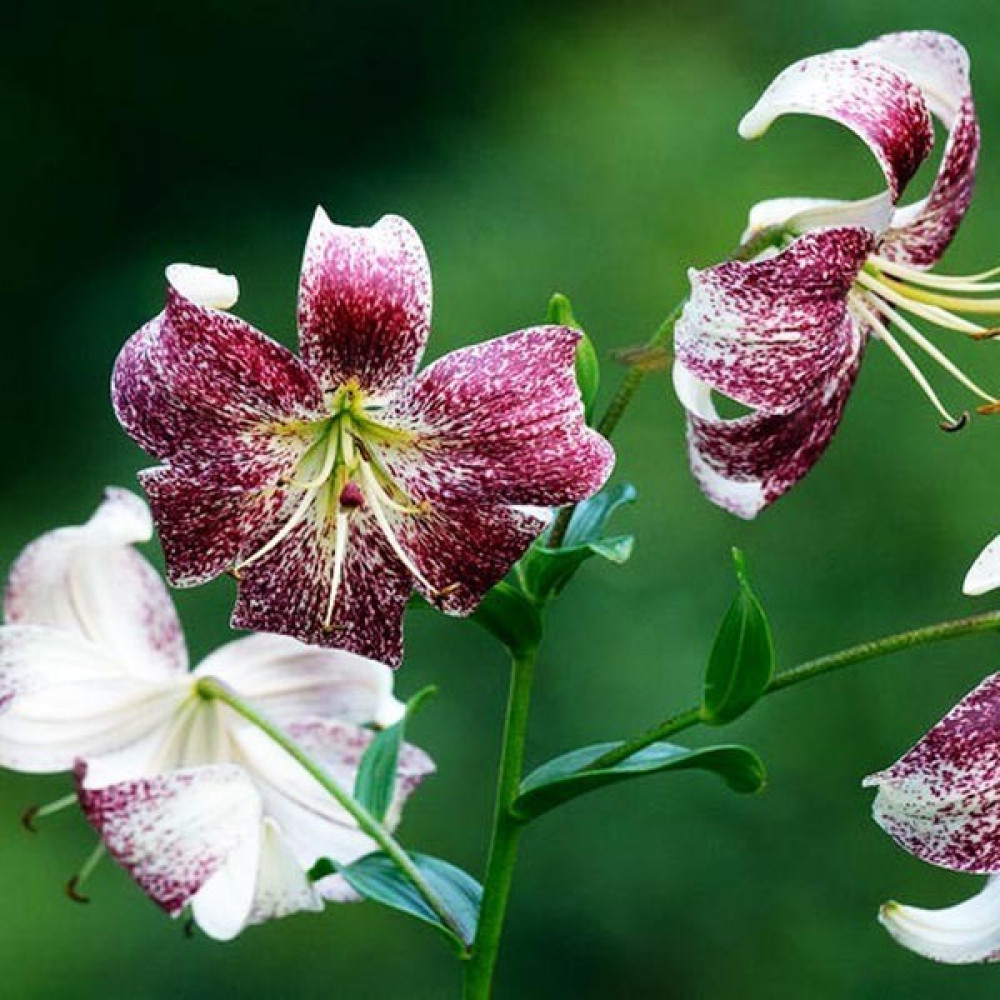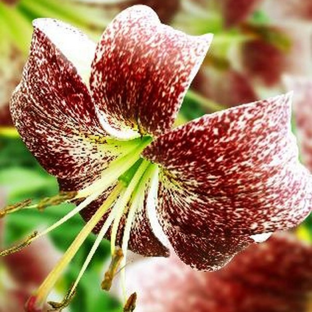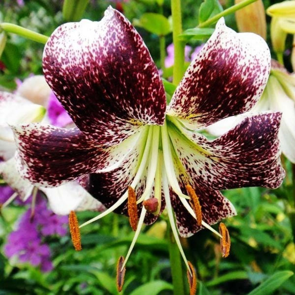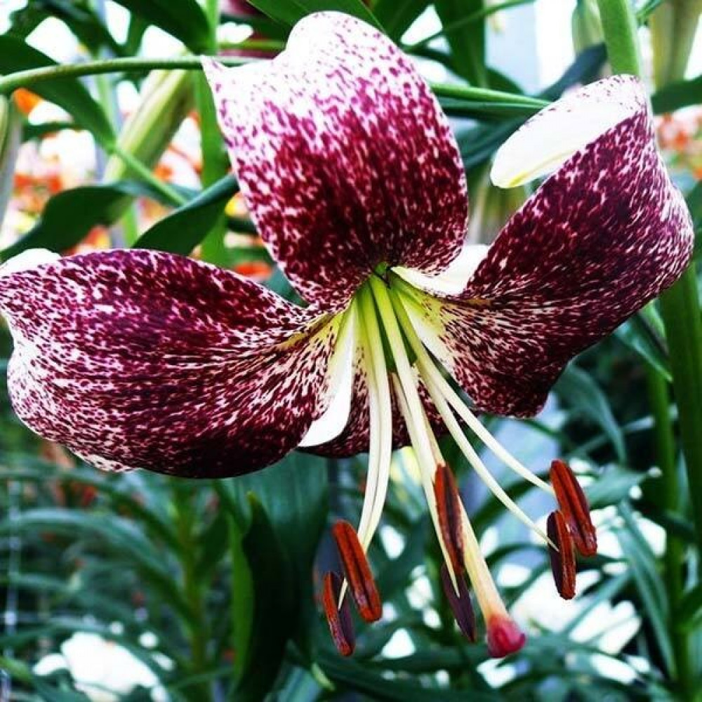 Лилия с чалмовидными белыми цветами, с сильным бордовым напылением по всем лепесткам, с бордовым крапом и оранжевыми тычинками, с войлочно-опушенным стеблем, несущим в пазухах листьев многочисленные бульбочки (луковички - детки). На стебле распускаются до 50 ароматных цветков. Стебель настолько крепкий, что может удержать такое количество цветов.