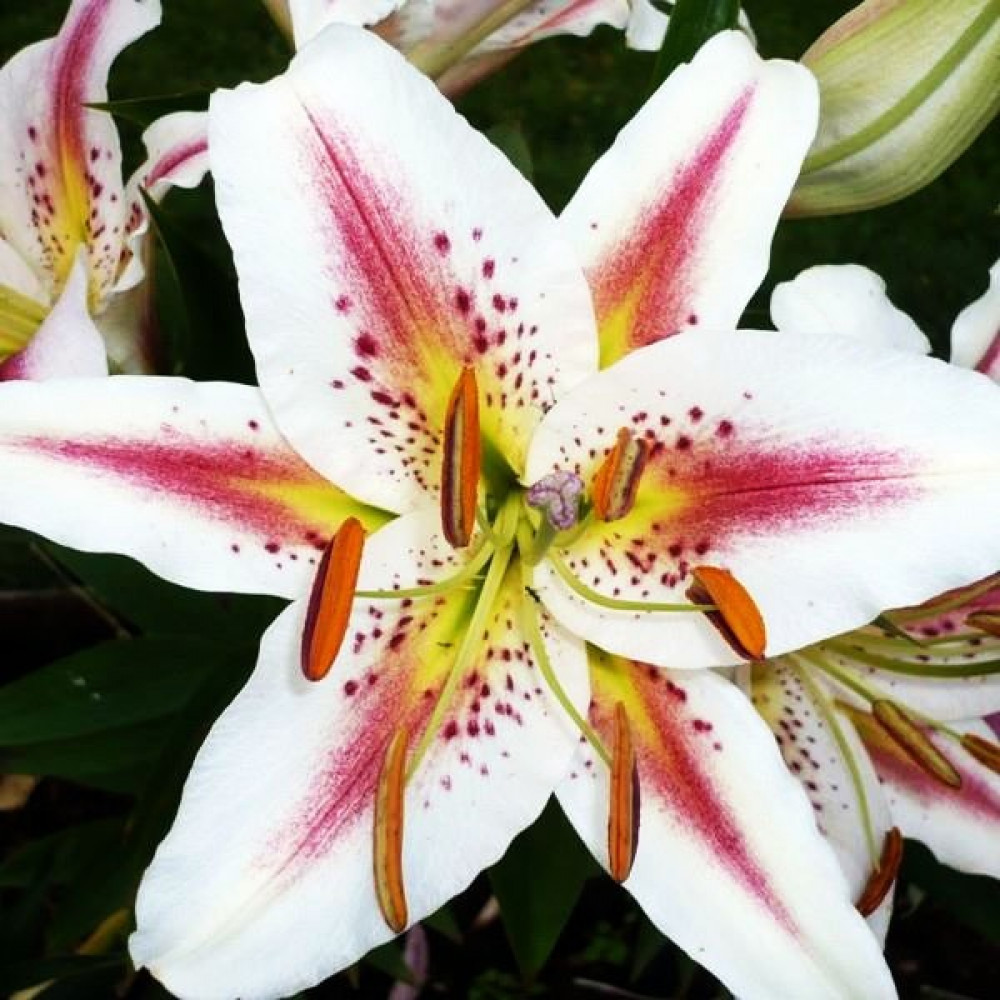 Ароматный и привлекательный восточный гибрид с огромными красивыми цветами, веселый и изысканный трехцветный сорт. Окраска лепестков белая с большими желто-малиновыми полосками и темно-красными веснушками, горло яблочно-зеленое. Листья насыщенного зеленого цвета. Зацветают лилии Arena ( Арена) в конце июня - начале июля, срезанные цветы долго сохраняются в воде.