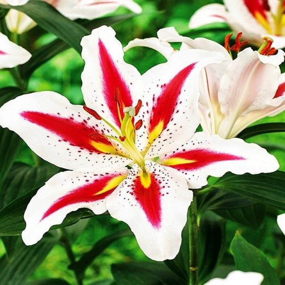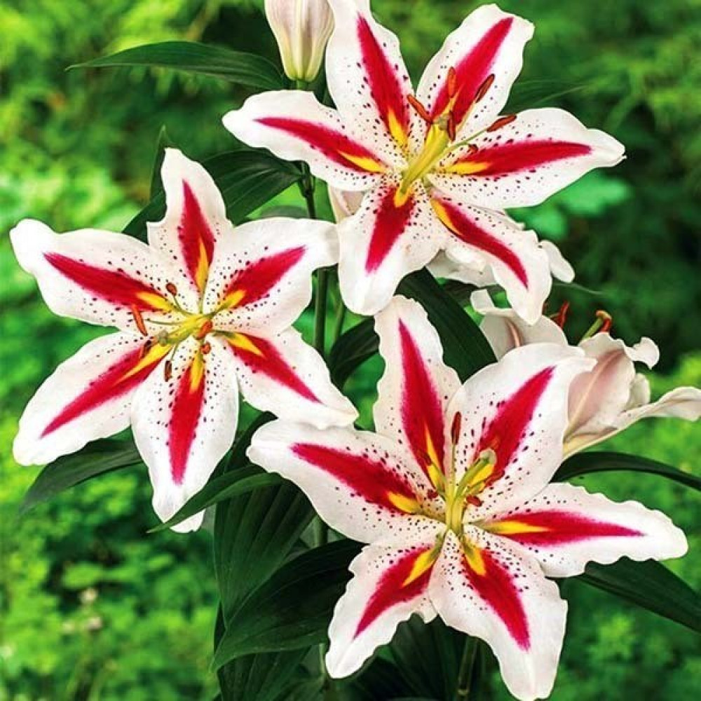 Стебли толстые, мощные, немного прогибаются. Цветы крупные, белоснежные, с малиново-бордовыми полосками. Обладают сильным ароматом. Цветут с конца июля до середины августа.