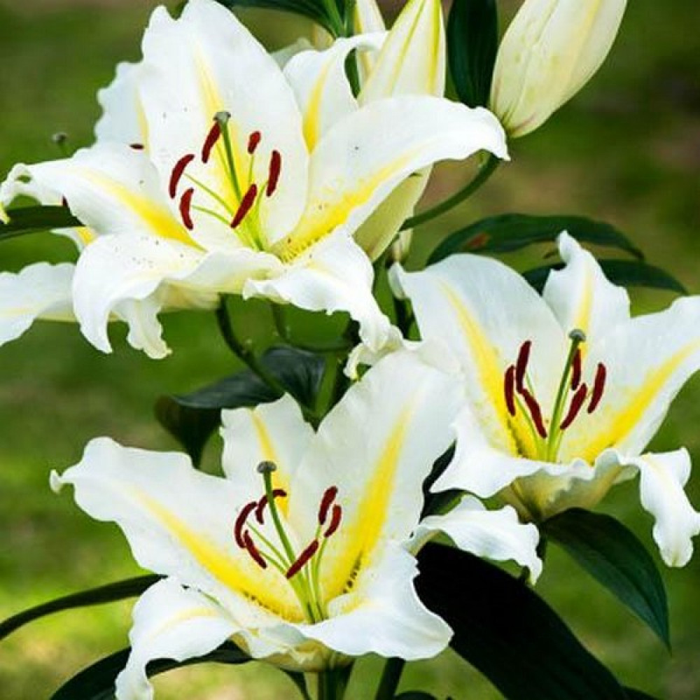 Лилия восточная Bufferi (Бафферари)- белоснежная красавица с золотой звездой в центре прекрасно смотрится в букете. А цветение этой лилии в саду невозможно сохранить в тайне: сладкий аромат, растекающийся по саду призывает всех найти его прекрасный источник и полюбоваться. Диаметр цветка 25м.