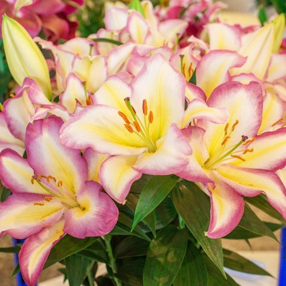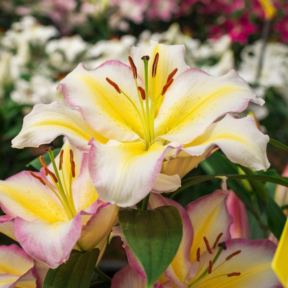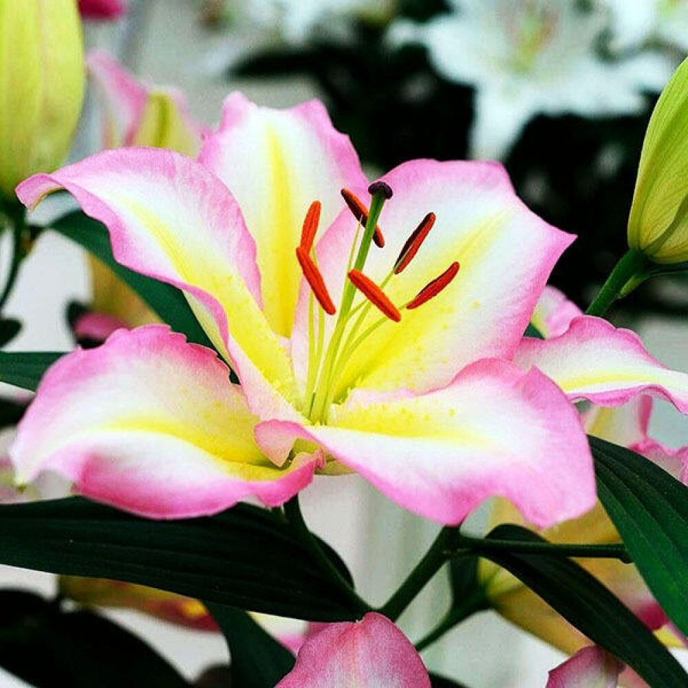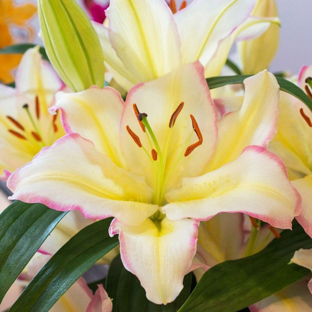 Огромные белоснежные цветки с розово-сиреневой волнистой каймой по краям лепестков и золотисто-лимонными полосками из центра наполнят сладковатым ароматом сад и комнату! Необычайно привлекательная, ароматная лилия! Отличный сорт для клумбы и срезки.