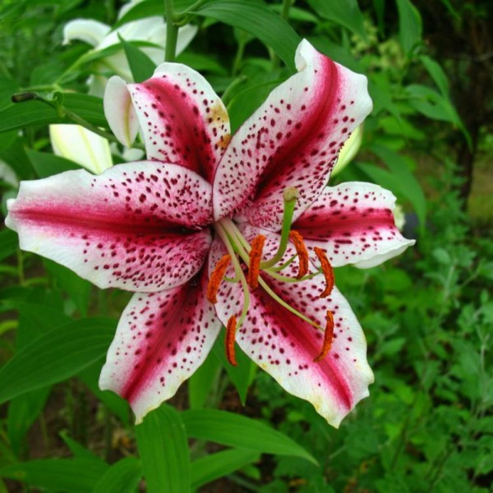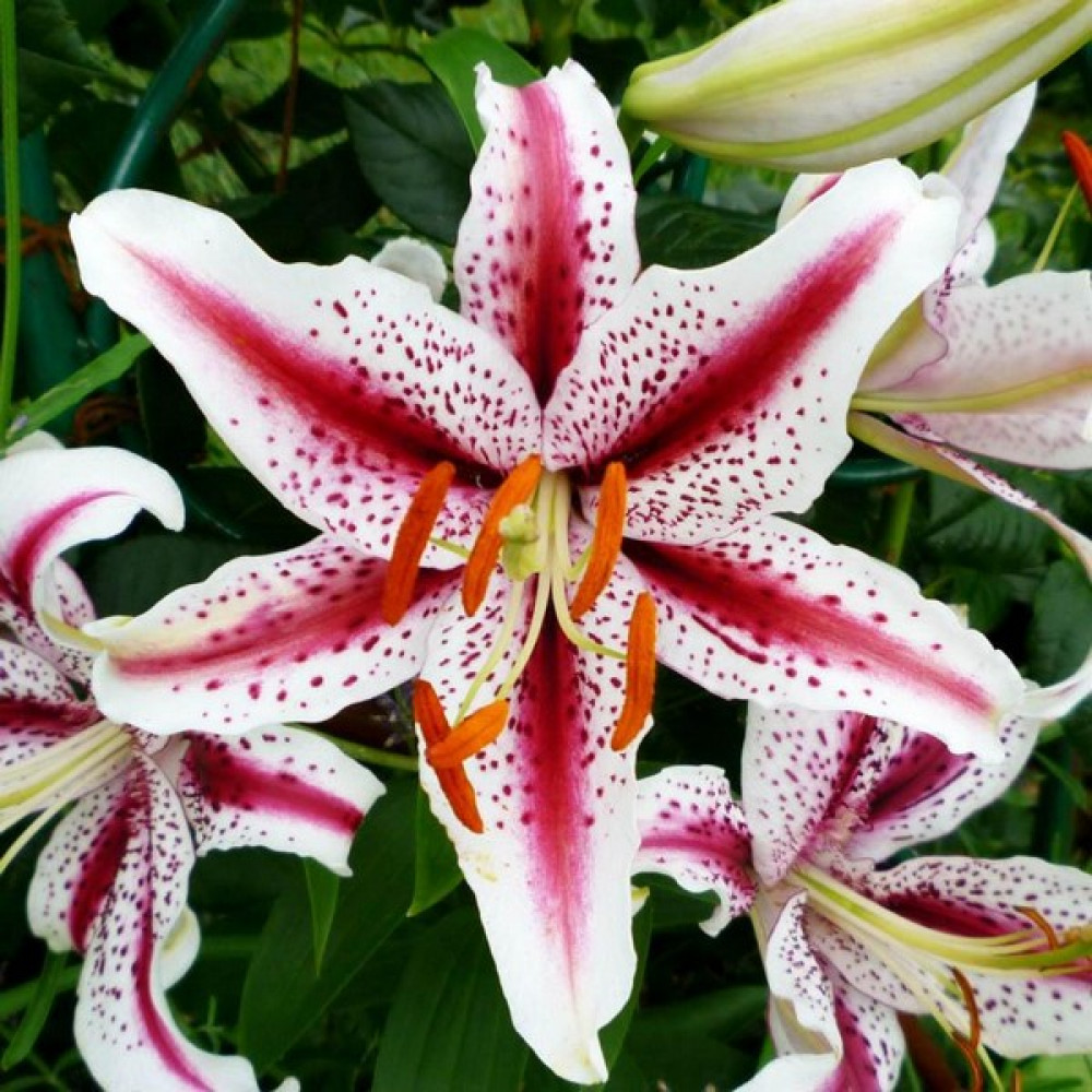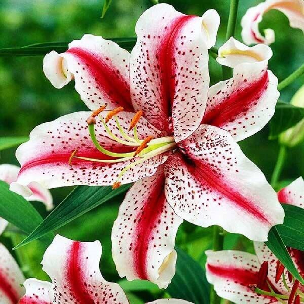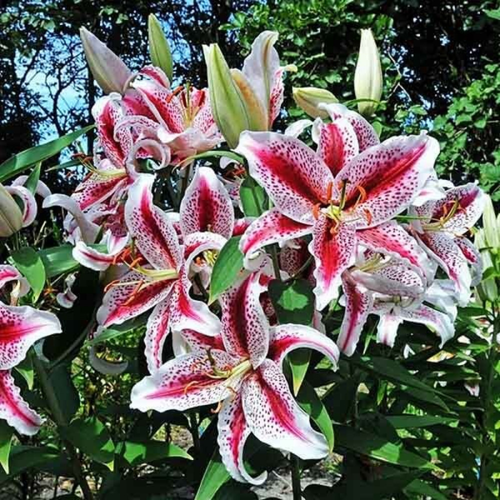 Лилия восточная Dizzy (Диззи) - благодаря своей расцветке эта лилия напоминает небольшого осьминога, который раскинул свои щупальца в приветственных объятиях. Белоснежный цветок имеет четко выраженные розовые полосы по центру лепестков, которые издалека напоминают щупальца. Цветок покрыт яркими багряными веснушками, а сердцевинка - это зеленые усики, которых венчают красные глазки «морского обитателя». Лилия хорошо переносит заморозки, но при этом любит солнце. Выделите ей самое солнечное место и наслаждайтесь издалека ее экзотичным видом и очень сильным, но приятным ароматом.