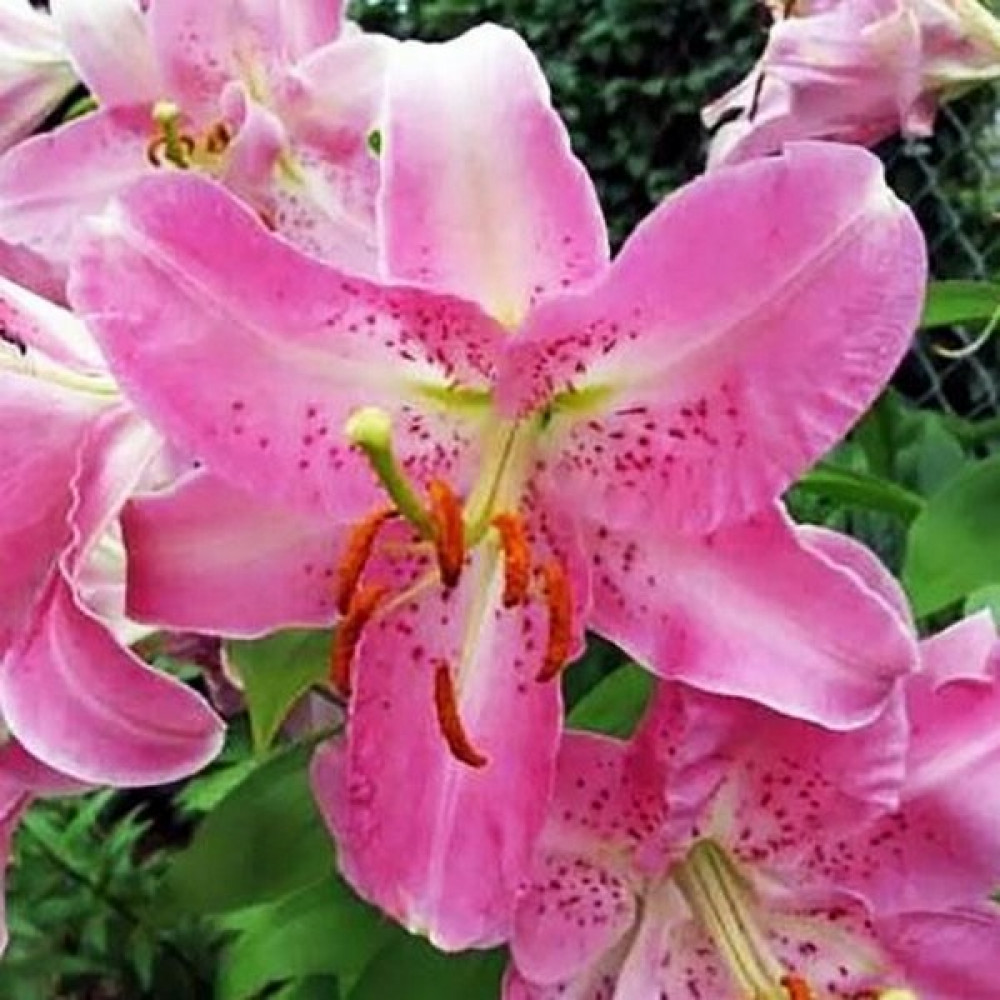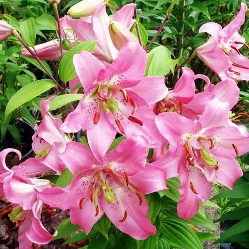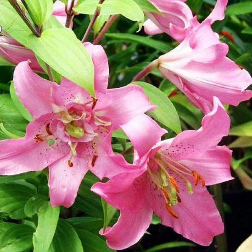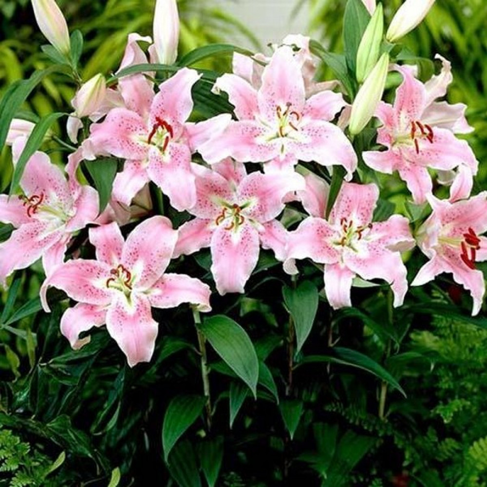 Лилия восточная Farolito (Фаролито) - компактные, немного махровые, нежно-розовые цветы лилии Фаролито необычайно декоративны. Распускаются по 2-3 на крепких цветоносах с темно-зелеными листьями. Лепестки слегка волнистые, остроконечные, отогнуты назад. Переливы розовых оттенков, мелкий крап бордового цвета, темно-коричневые пыльники – все это делает цветок одновременно и нежным, и ярким. Диаметр цветка 15 см, высота 50 см. Прекрасно подходит для выращивания не только на первом плане цветника, но и в вазонах на террасе или балконе (для горшечного выращивания). Хороши на срезку, аромат нежный, приятный. Предпочитает нейтральную или слабокислую хорошо дренированную почву.