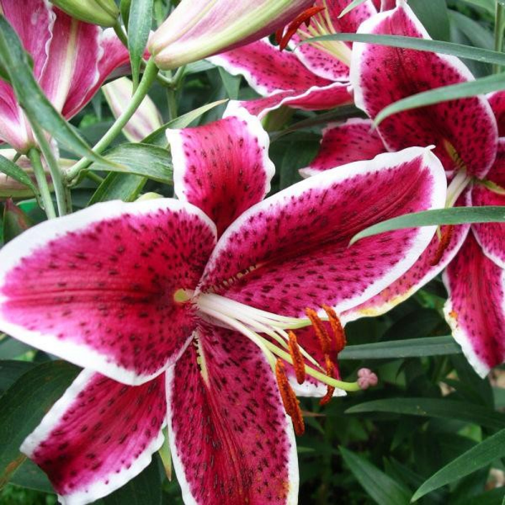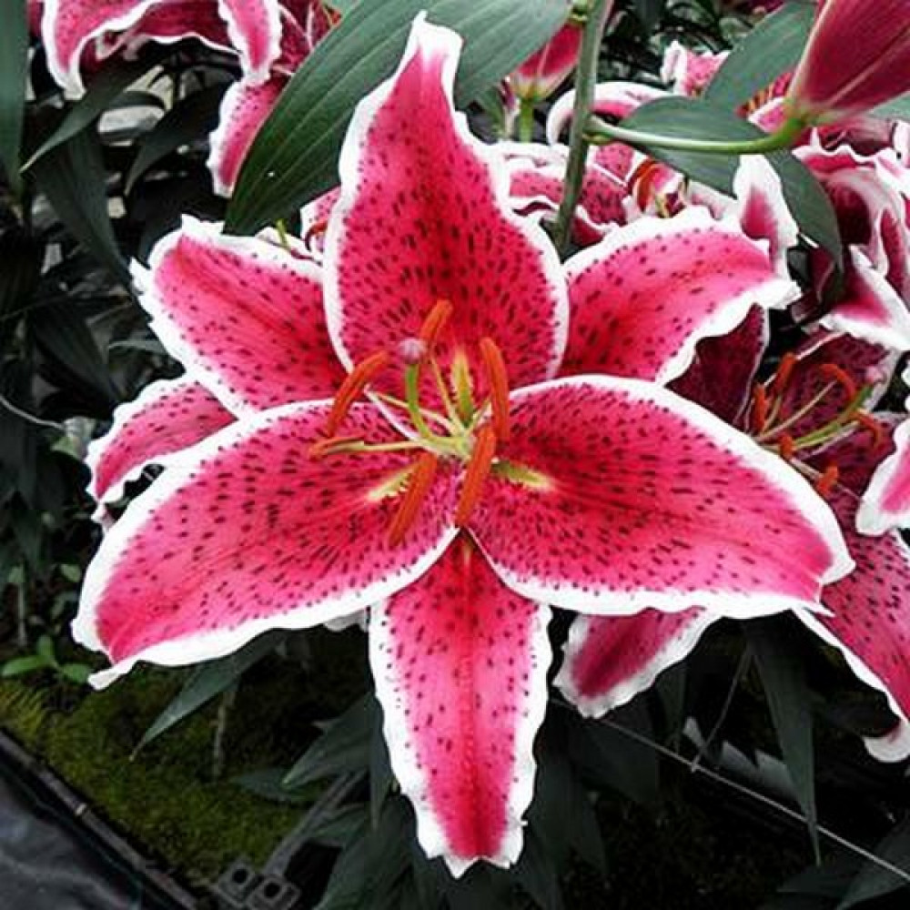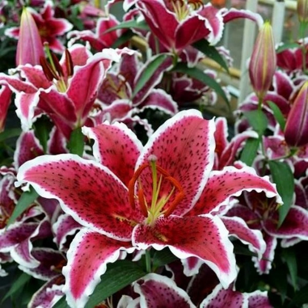 Лилия восточная Front Page (Фронт Пейдж)-Одна из самых нарядных восточных лилий и одна из самых крупных лилий в этой группе. Цветки ярко-розовые (красные) с фиолетово-розовым насыщением по центру и белой каймой, лёгкое гофре с многочисленными бордовыми точками, лепестки звездчатой формы со слегка завернутыми кончиками. Диаметр цветка 25 см, форма звездчатая, направлены вверх. Сильный аромат. Стебель мощный, 110 см высотой. В соцветии 3-9 бутонов (зависит от размера луковицы). Цветение через 100-110 дней после всходов. Хороши в посадках заднего плана.
