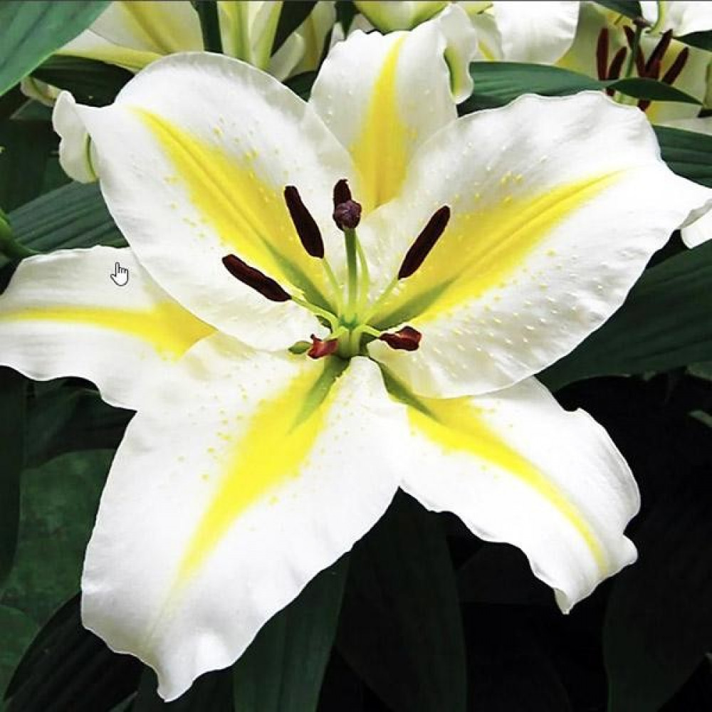 Прекрасная лилия с изысканной окраской. Лепестки белые, чуть волнистые с ярко-жёлтыми полосками и зелёным центром. Растут вверх и в стороны. Имеет приятный аромат.