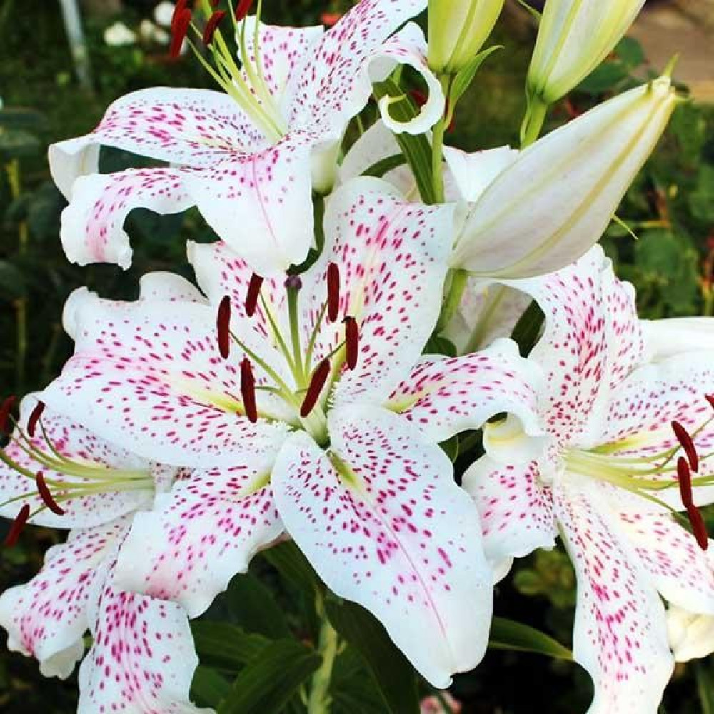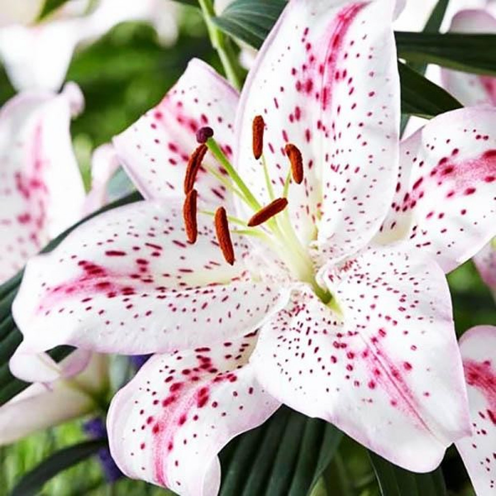 Очень эффектный сорт. Белая лилия с темно-розовым крапом и розовыми линиями на верхней части лепестка. Цветы ароматные, крупные.